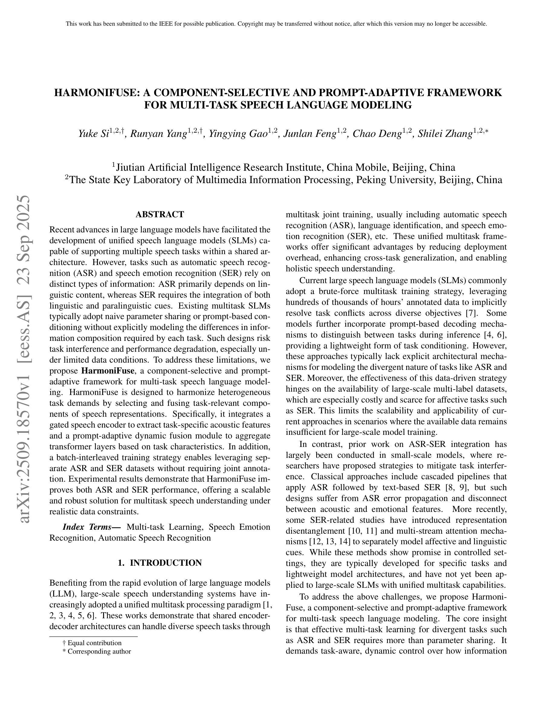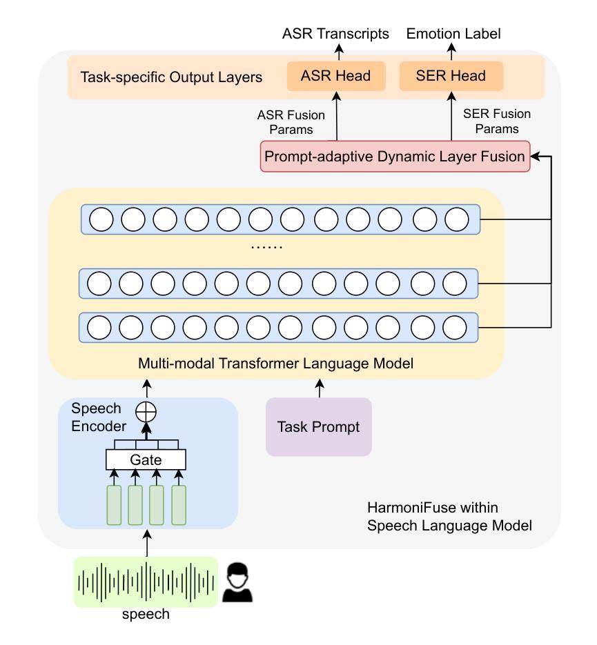 近期大型语言模型的进步促进了统一语音语言模型(SLM)的发展,这种模型能够在共享架构内支持多种语音任务。然而,自动语音识别(ASR)和语音情感识别(SER)等任务依赖于不同类型的信息:ASR主要依赖于语言内容,而SER则需要整合语言和副语言线索。现有的多任务SLM通常采用简单的参数共享或基于提示的条件设置,而没有明确建模每个任务所需的信息组成的差异。这种设计存在任务干扰和性能下降的风险,特别是在数据有限的情况下。为了解决这些局限性,我们提出了HarmoniFuse,这是一个用于多任务语音语言建模的组件选择和提示自适应框架。HarmoniFuse旨在通过选择和融合与任务相关的语音表示组件来协调异质的任务需求。具体来说,它集成了门控语音编码器以提取特定于任务的声学特征,以及一个提示自适应动态融合模块,该模块基于任务特性聚合变压器层。此外,批内交错训练策略使得我们能够利用单独的ASR和SER数据集,而无需联合注释。实验结果表明,HarmoniFuse提高了ASR和SER的性能,为现实数据约束下的多任务语音理解提供了可扩展且稳健的解决方案。