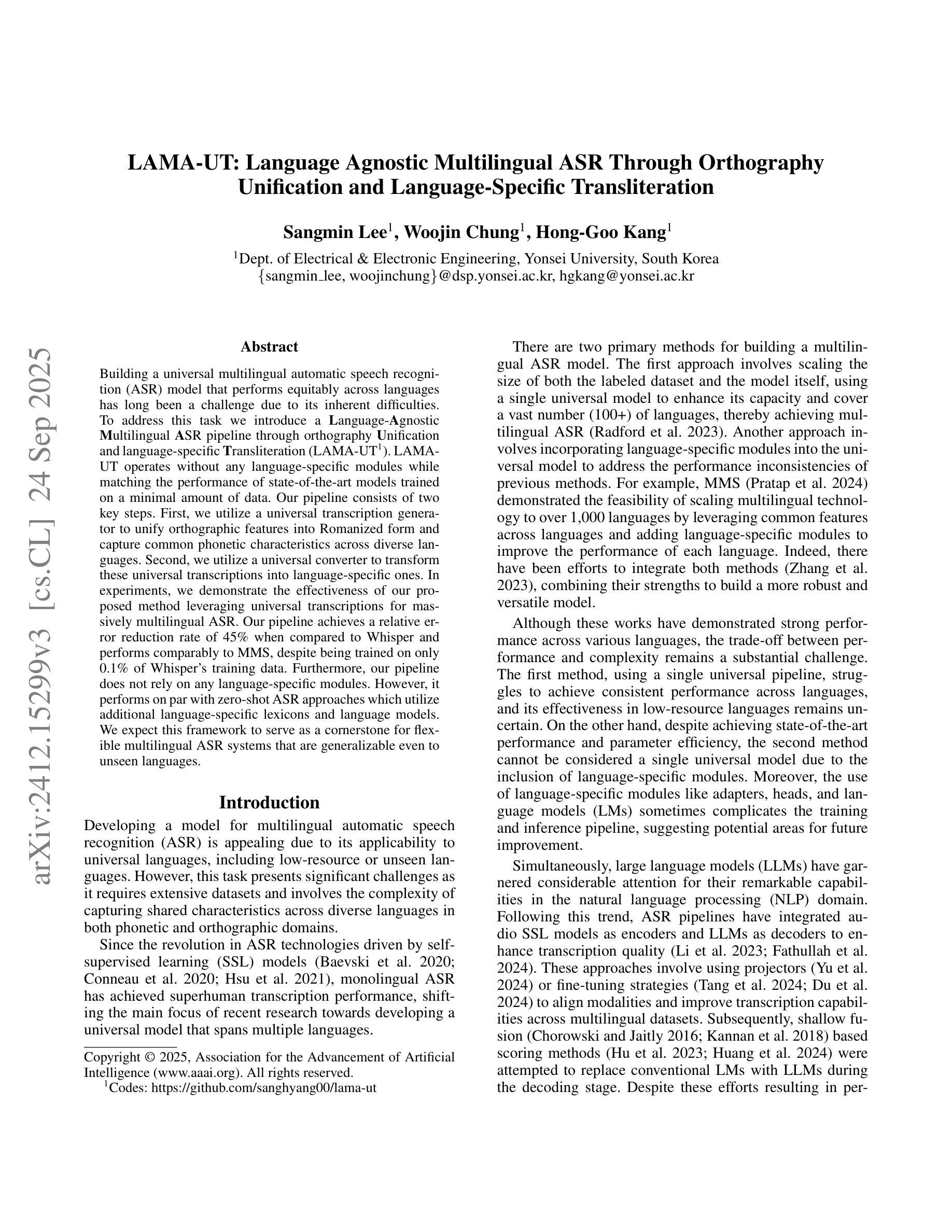 Building a universal multilingual automatic speech recognition (ASR) model that performs equitably across languages has long been a challenge due to its inherent difficulties. To address this task we introduce a Language-Agnostic Multilingual ASR pipeline through orthography Unification and language-specific Transliteration (LAMA-UT). LAMA-UT operates without any language-specific modules while matching the performance of state-of-the-art models trained on a minimal amount of data. Our pipeline consists of two key steps. First, we utilize a universal transcription generator to unify orthographic features into Romanized form and capture common phonetic characteristics across diverse languages. Second, we utilize a universal converter to transform these universal transcriptions into language-specific ones. In experiments, we demonstrate the effectiveness of our proposed method leveraging universal transcriptions for massively multilingual ASR. Our pipeline achieves a relative error reduction rate of 45% when compared to Whisper and performs comparably to MMS, despite being trained on only 0.1% of Whisper’s training data. Furthermore, our pipeline does not rely on any language-specific modules. However, it performs on par with zero-shot ASR approaches which utilize additional language-specific lexicons and language models. We expect this framework to serve as a cornerstone for flexible multilingual ASR systems that are generalizable even to unseen languages.
