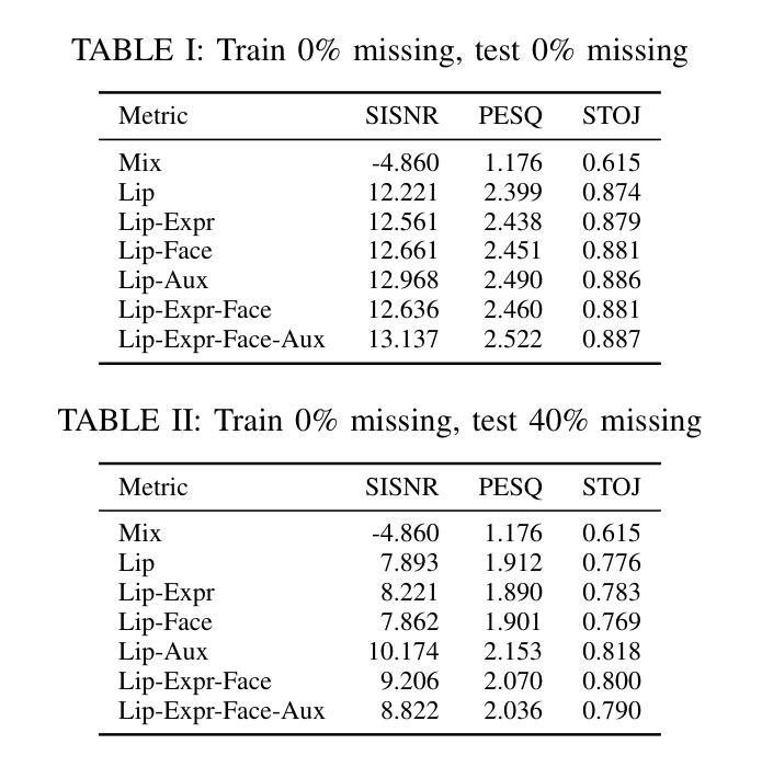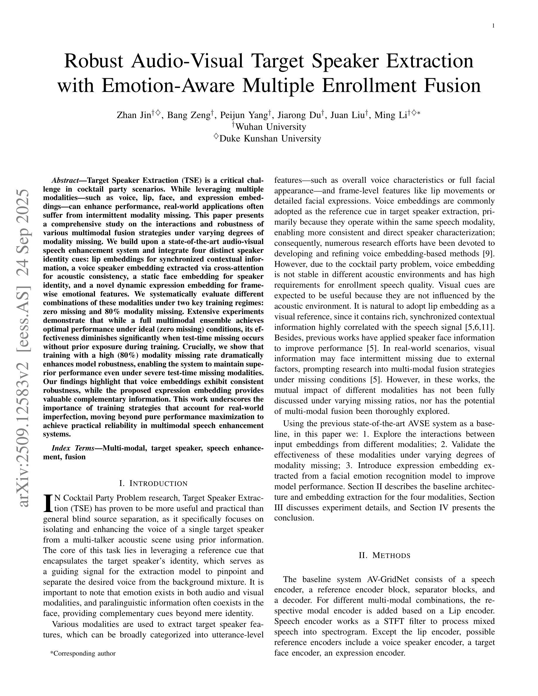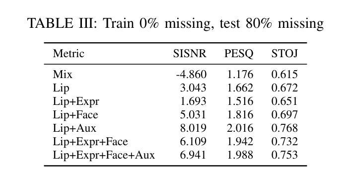 目标说话人提取(TSE)是鸡尾酒会场景中的一个关键挑战。虽然利用多种模态(如语音、嘴唇、面部和表情嵌入)可以提高性能,但实际应用中经常受到间歇性模态中断的影响。本文对不同模态融合策略在不同模态中断程度下的交互和稳健性进行了全面研究。我们基于先进的视听语音增强系统,集成了四种不同的说话人身份线索:用于同步上下文信息的嘴唇嵌入、通过交叉注意力提取的语音说话人嵌入以用于声音一致性、用于说话人身份的静态面部嵌入、以及用于帧级情感特征的新型动态表情嵌入。我们系统地评估了这两种关键训练制度下的不同模态组合:零中断和80%的模态中断。大量实验表明,虽然在理想条件下(零中断),全模态集合达到最佳性能,但当测试时发生中断且训练期间未暴露于中断时,其有效性会显著降低。关键的是,我们表明,以高(80%)的模态中断率进行训练可以极大地提高模型的稳健性,使系统在测试时即使在严重缺失模态的情况下也能保持卓越的性能。我们的研究结果表明,语音嵌入表现出持续的稳健性,而所提出的表情嵌入提供了有价值的补充信息。这项工作强调了训练策略的重要性,这些策略要考虑到现实世界的缺陷,超越单纯的性能最大化,以实现多模态语音增强系统的实际可靠性。