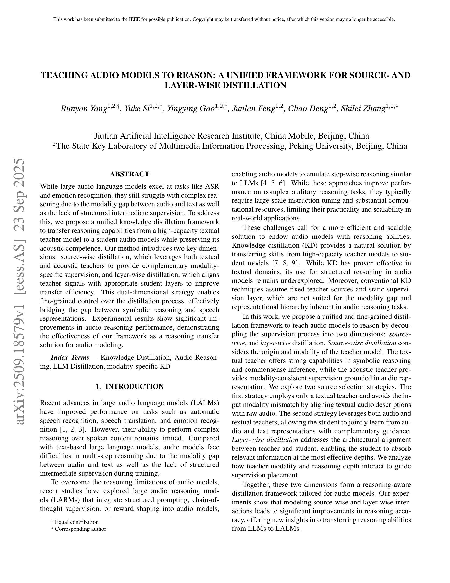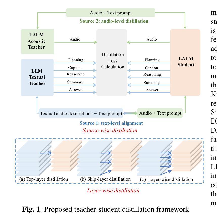 虽然大型音频语言模型在语音识别和情感识别等任务上表现出色,但由于音频和文本之间的模态差距以及缺乏结构化中间监督,它们在复杂推理方面仍面临挑战。为了解决这一问题,我们提出了一个统一的知识蒸馏框架,以从高容量的文本教师模型向学生音频模型转移推理能力,同时保留其声学能力。我们的方法引入了两个关键维度:源级蒸馏,利用文本和声音教师提供补充的模态特定监督;和层级蒸馏,将教师信号与适当的学生层对齐,以提高传输效率。这种双重维度的策略可以对蒸馏过程进行精细控制,有效地弥合了符号推理和语音表示之间的差距。实验结果表明,在音频推理性能方面取得了显著改进,证明了我们框架作为音频建模推理解决方案的有效性。