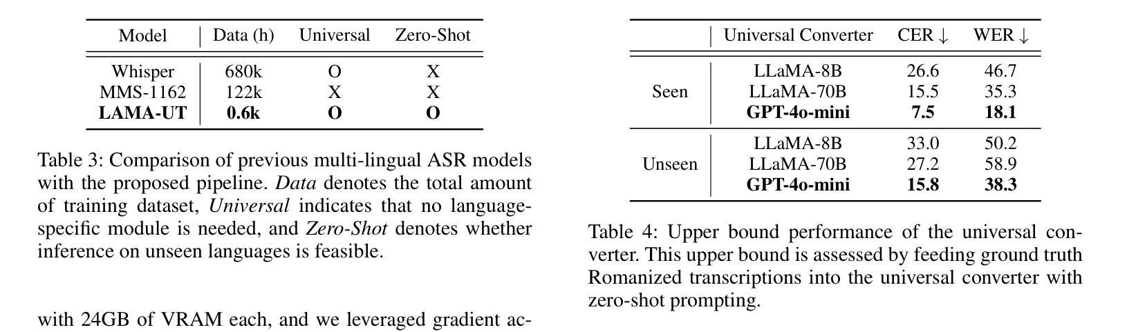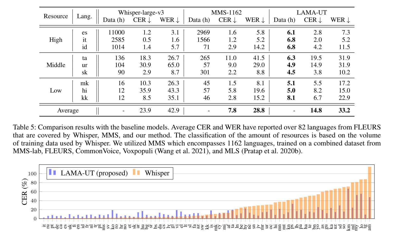 - LAMA-UT与MMS表现相当,尽管只使用了whisper 0.1%的训练数据。