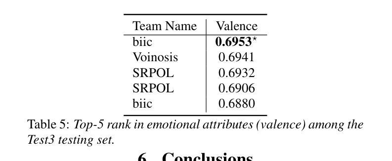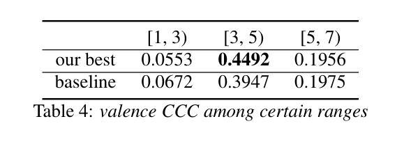 - 多模态融合模型取得最佳效价得分,在情感属性回归任务中表现优异。