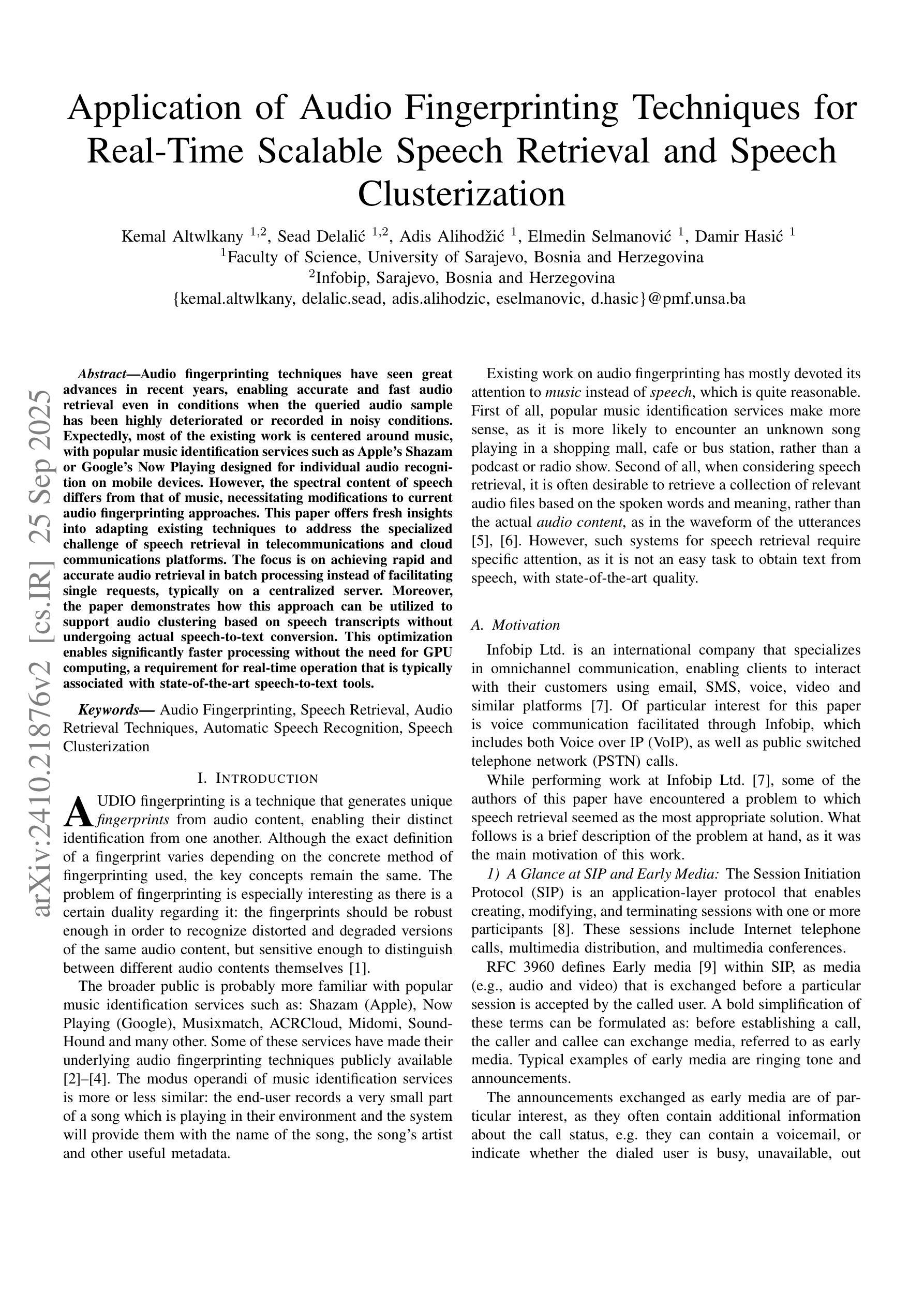 Audio fingerprinting techniques have seen great advances in recent years, enabling accurate and fast audio retrieval even in conditions when the queried audio sample has been highly deteriorated or recorded in noisy conditions. Expectedly, most of the existing work is centered around music, with popular music identification services such as Apple’s Shazam or Google’s Now Playing designed for individual audio recognition on mobile devices. However, the spectral content of speech differs from that of music, necessitating modifications to current audio fingerprinting approaches. This paper offers fresh insights into adapting existing techniques to address the specialized challenge of speech retrieval in telecommunications and cloud communications platforms. The focus is on achieving rapid and accurate audio retrieval in batch processing instead of facilitating single requests, typically on a centralized server. Moreover, the paper demonstrates how this approach can be utilized to support audio clustering based on speech transcripts without undergoing actual speech-to-text conversion. This optimization enables significantly faster processing without the need for GPU computing, a requirement for real-time operation that is typically associated with state-of-the-art speech-to-text tools.