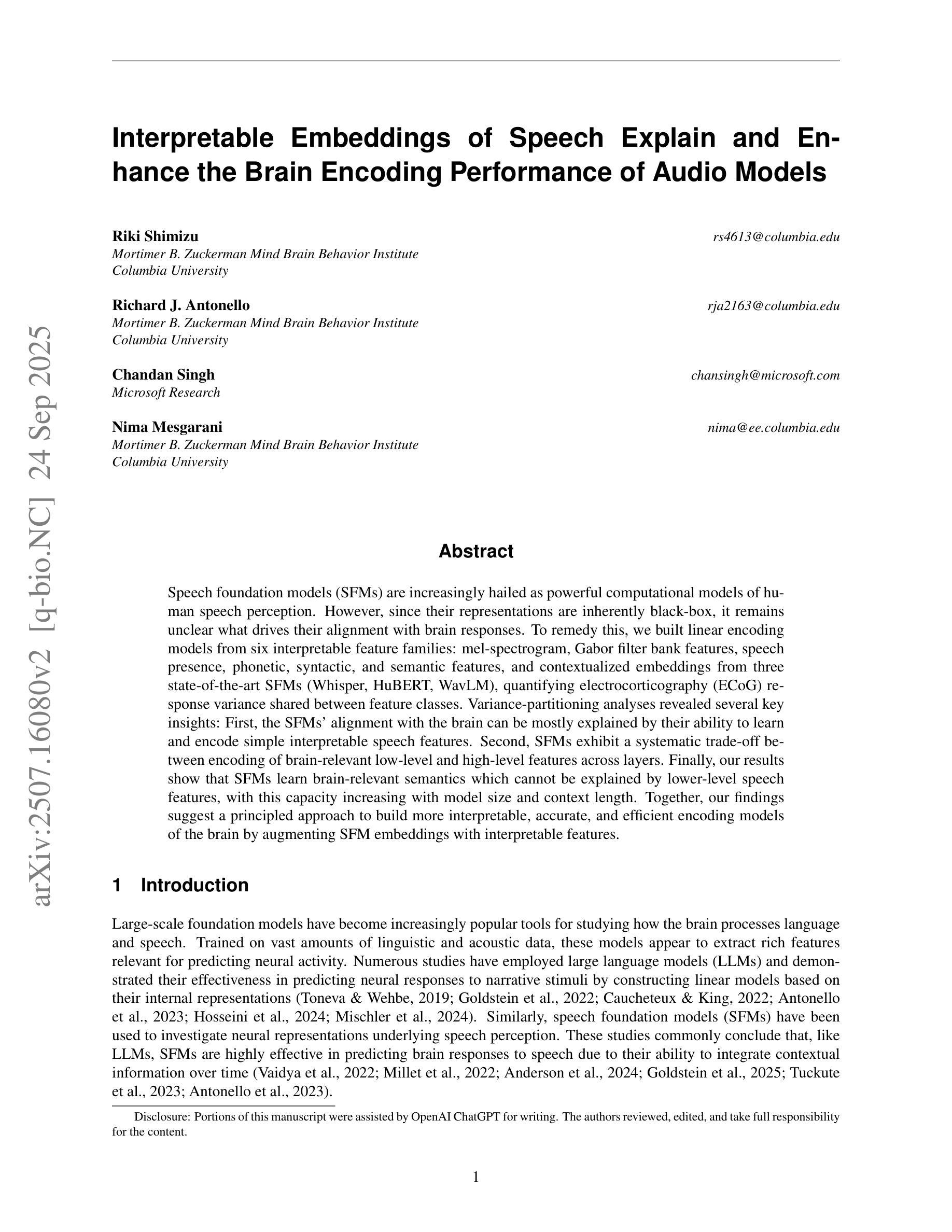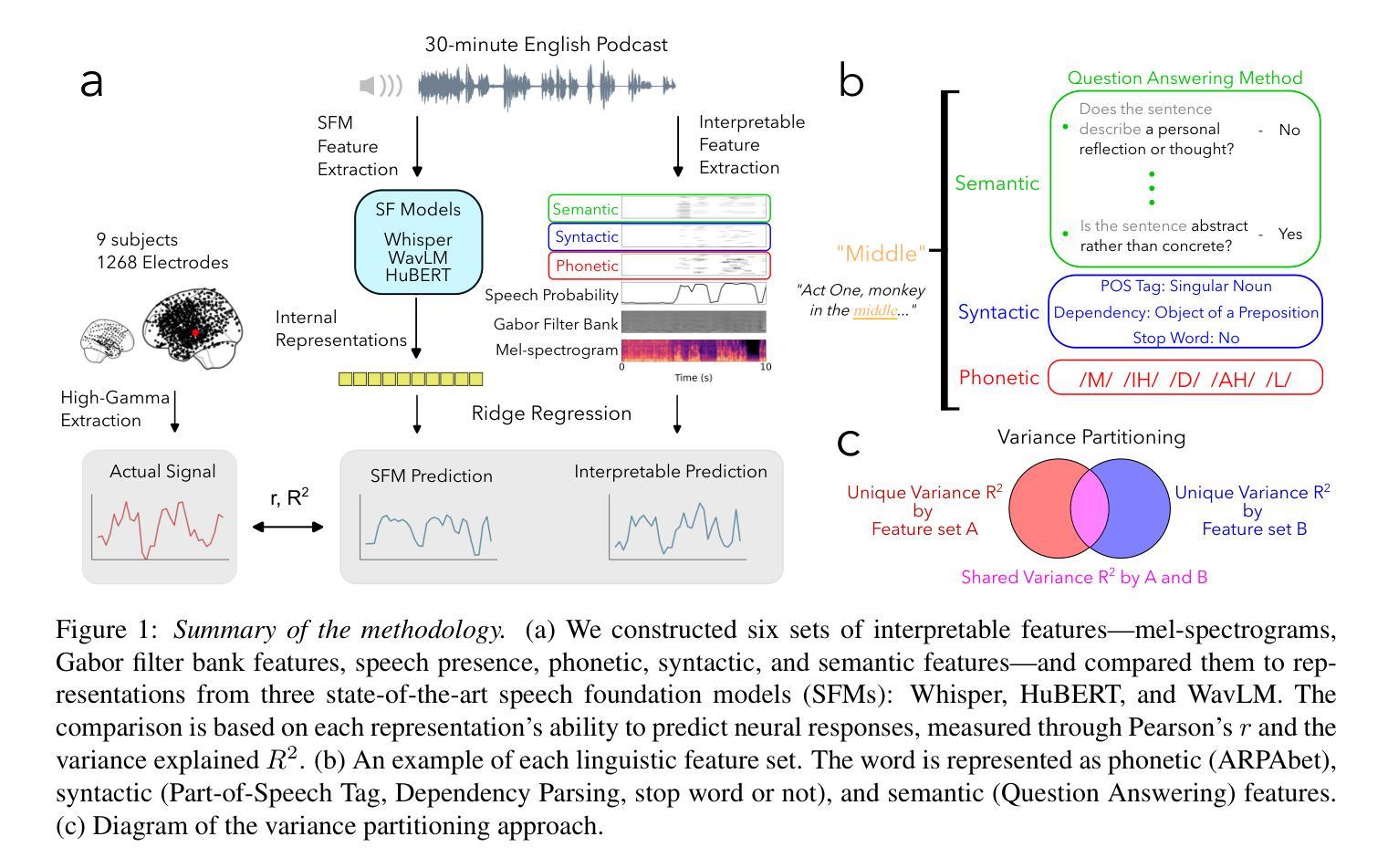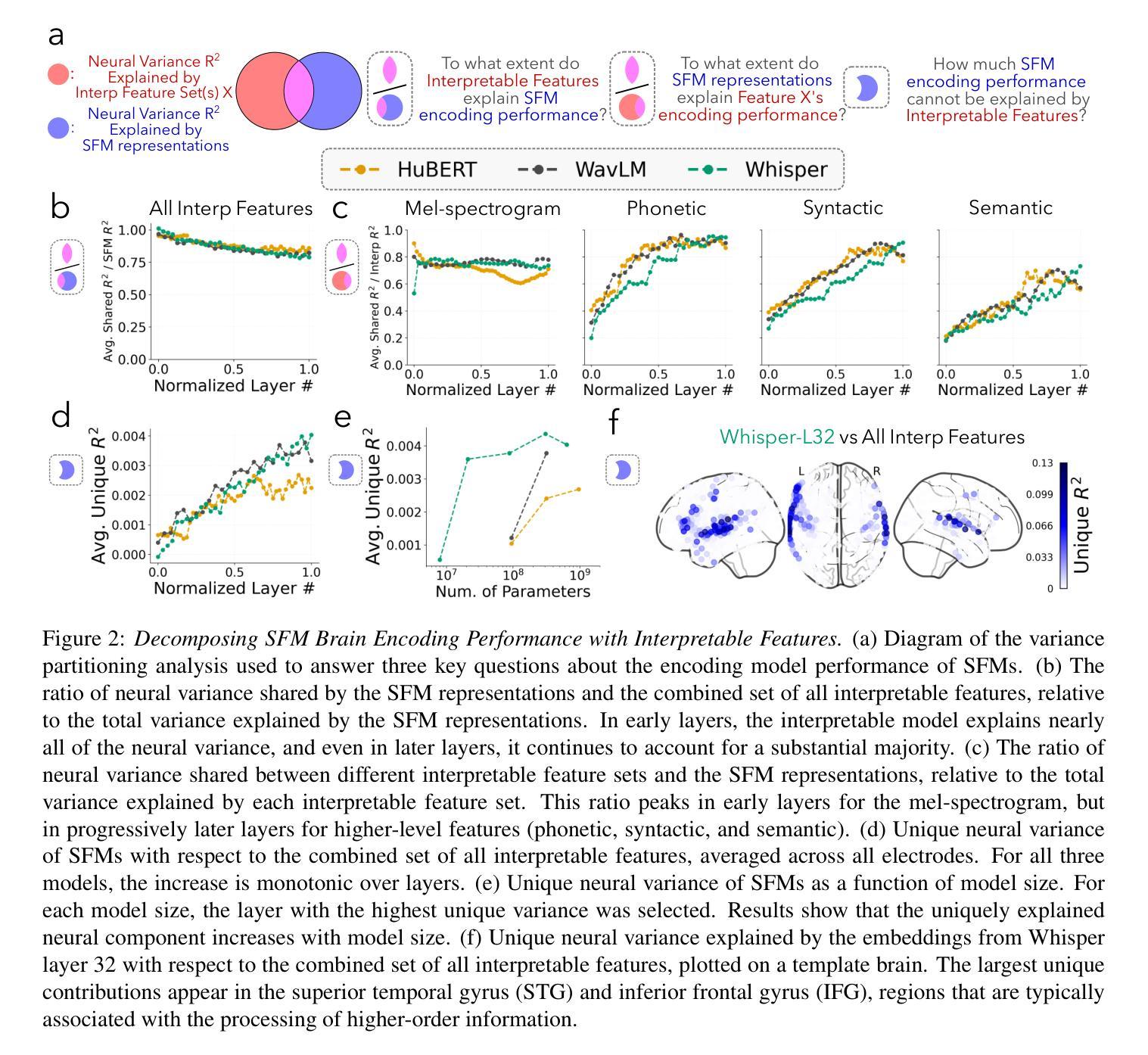 语音基础模型(SFMs)被越来越多地誉为人类语音感知的强大计算模型。然而,由于它们的表示本质上是黑箱,尚不清楚是什么驱动它们与大脑反应的匹配。为了弥补这一缺陷,我们从六个可解释的特征家族中构建了线性编码模型:梅尔频谱图、Gabor滤波器组特征、语音存在特征、语音特征、句法特征和语义特征,以及来自三种最先进的SFM(Whisper、HuBERT、WavLM)的上下文嵌入,量化电皮质图(ECoG)在特征类别之间共享的反应方差。方差分配分析揭示了几个关键见解:首先,SFM与大脑的匹配度主要可以解释为它们学习和编码简单可解释的语音特征的能力。其次,SFM在编码与大脑相关的高级和低级特征时,各层级间存在系统性权衡。最后,我们的结果表明,SFM学习到的与大脑相关的语义无法仅通过低级语音特征来解释,且这种能力随着模型大小和上下文长度的增加而增强。总之,我们的研究结果表明,通过增强SFM嵌入与可解释特征,可以建立更具原则性、更准确和高效的脑编码模型。