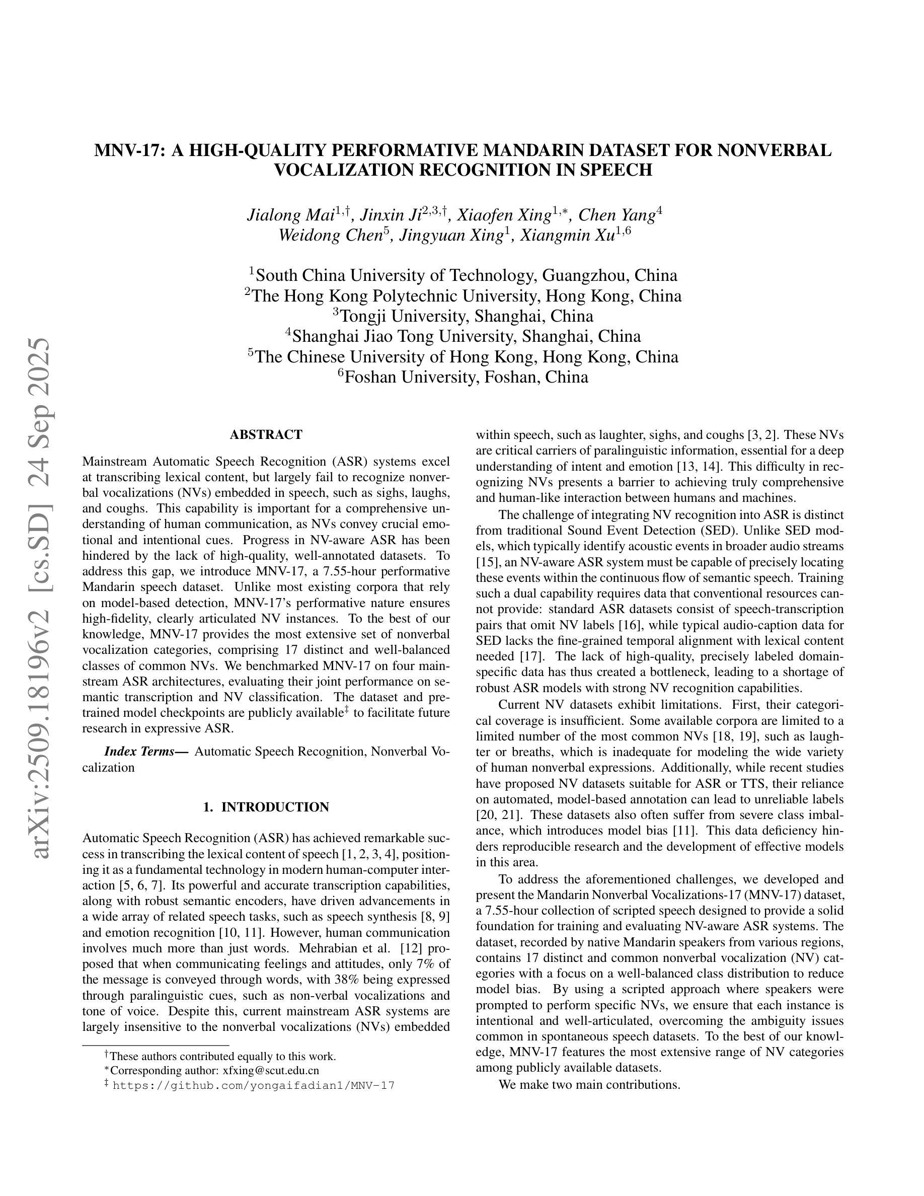 Mainstream Automatic Speech Recognition (ASR) systems excel at transcribing lexical content, but largely fail to recognize nonverbal vocalizations (NVs) embedded in speech, such as sighs, laughs, and coughs. This capability is important for a comprehensive understanding of human communication, as NVs convey crucial emotional and intentional cues. Progress in NV-aware ASR has been hindered by the lack of high-quality, well-annotated datasets. To address this gap, we introduce MNV-17, a 7.55-hour performative Mandarin speech dataset. Unlike most existing corpora that rely on model-based detection, MNV-17’s performative nature ensures high-fidelity, clearly articulated NV instances. To the best of our knowledge, MNV-17 provides the most extensive set of nonverbal vocalization categories, comprising 17 distinct and well-balanced classes of common NVs. We benchmarked MNV-17 on four mainstream ASR architectures, evaluating their joint performance on semantic transcription and NV classification. The dataset and the pretrained model checkpoints will be made publicly available to facilitate future research in expressive ASR.