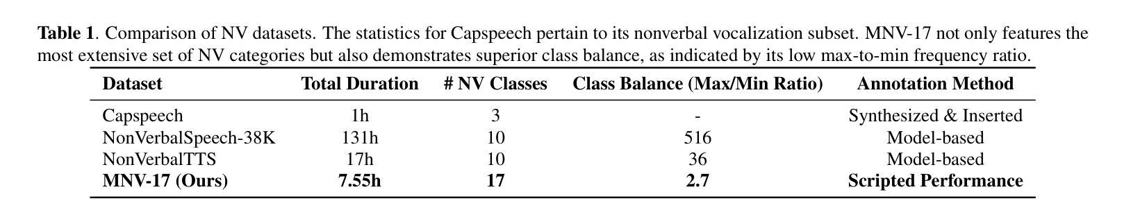 - MNV-17数据集具有表演性特点,确保非语言声音实例的高保真和清晰性。