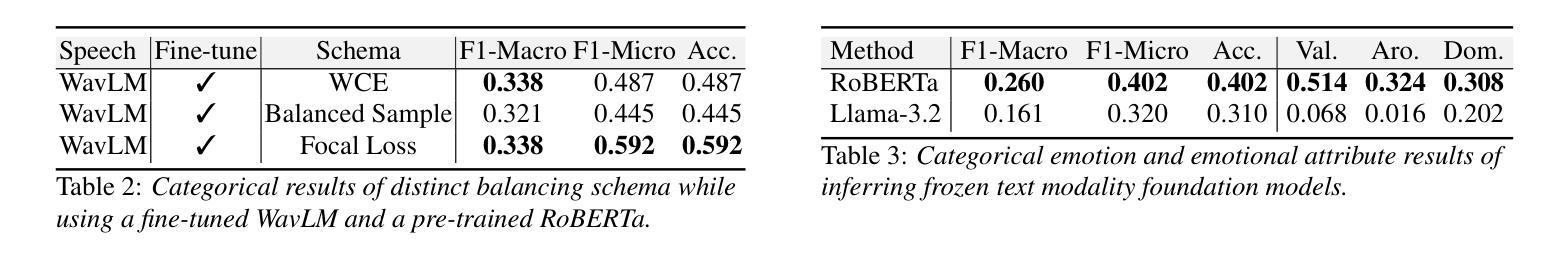 - 语音嵌入展现出稳健性,而表情嵌入提供了有价值的辅助信息。