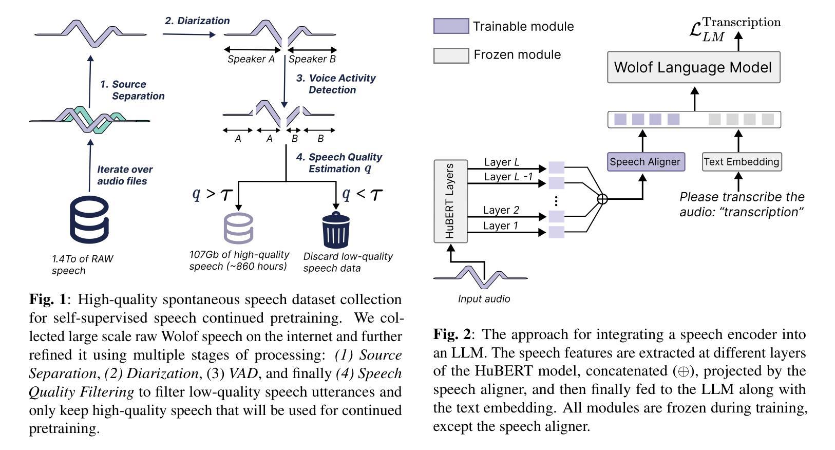 本文介绍了对西非地区的沃尔夫语言进行语言模型训练的过程,并分享了关键见解。文章强调收集大规模、自发、高质量的无监督语音数据的重要性,展示在此基础上继续进行HuBERT预训练的优势。接着,将语音编码器集成到沃尔夫语言的大型语言模型中,扩展其语音翻译等功能。此外,探索了让语言模型进行多步骤Chain-of-Thought训练,以提高其语音识别和翻译性能。模型及代码将公开共享。