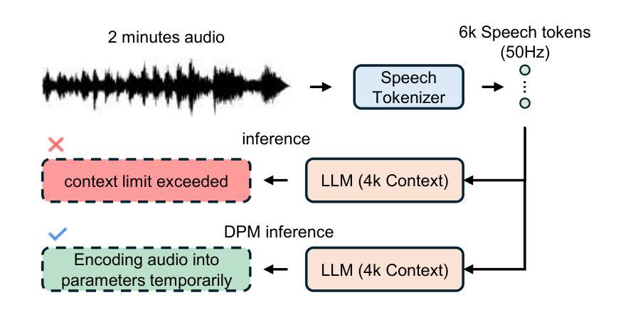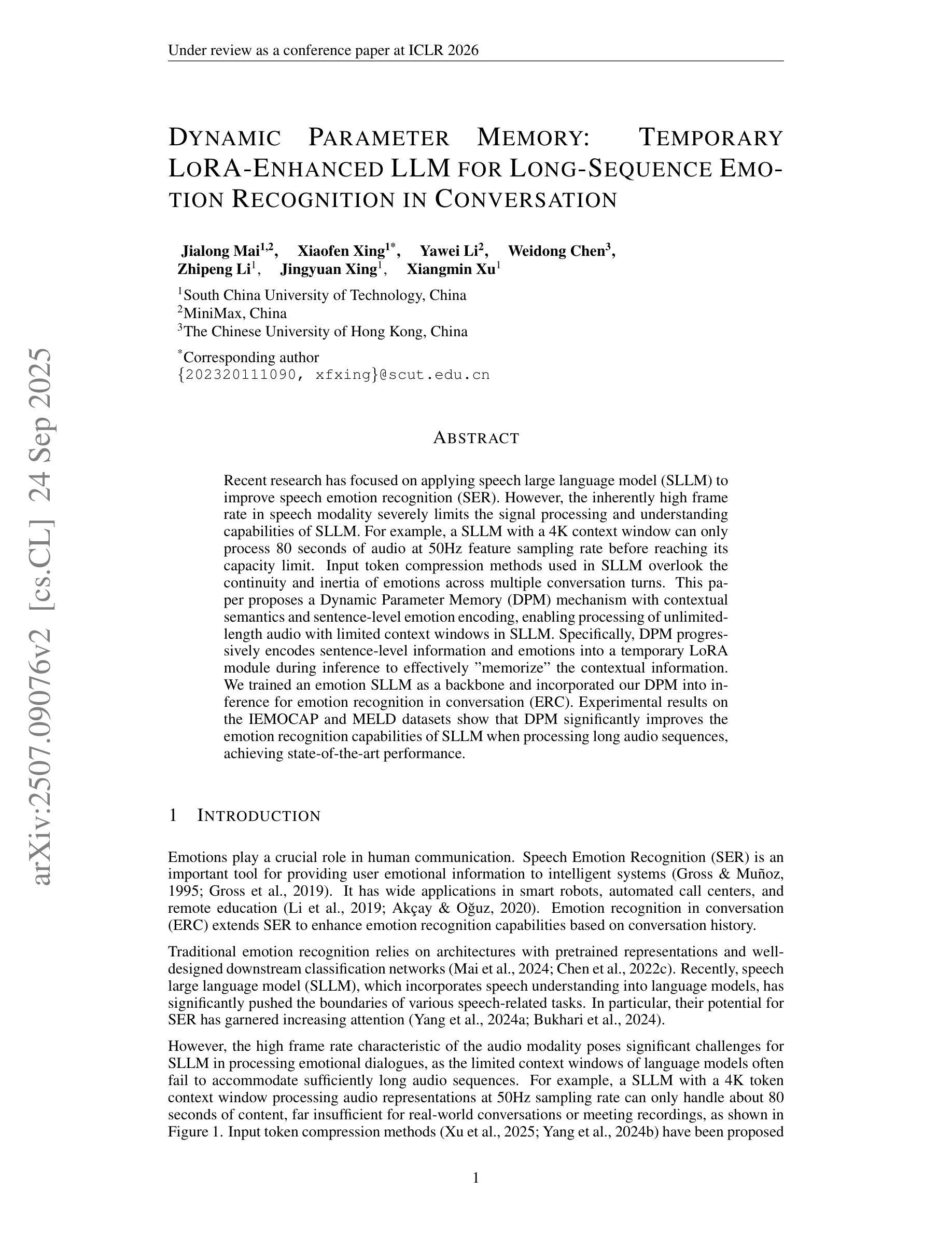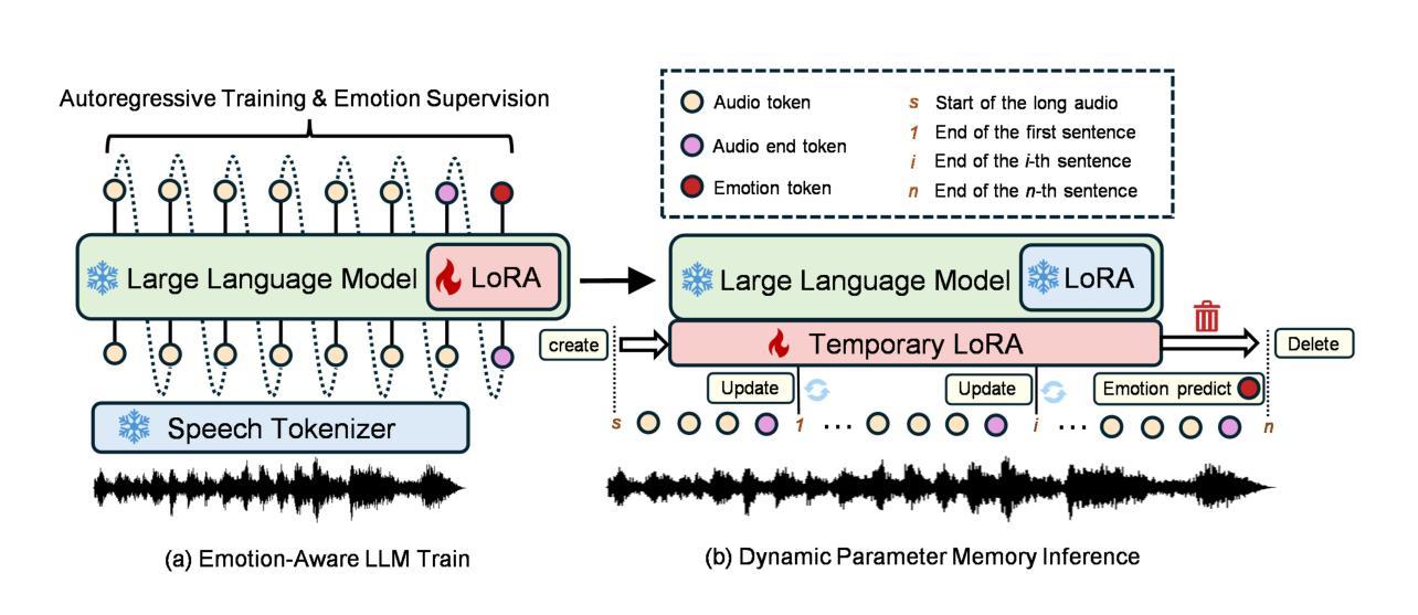 近期研究将语音大语言模型(SLLM)应用于语音情感识别(SER)的提升。然而,语音模态的高帧率严重限制了SLLM的信号处理和理解能力。本文提出一种动态参数记忆(DPM)机制,结合上下文语义和句子级情感编码,在有限的语境窗口内实现无限长度音频的处理。DPM将句子级信息和情感逐步编码到临时LoRA模块中,有效“记忆”上下文信息。在IEMOCAP数据集上的实验结果表明,DPM在处理长音频序列时显著提高了SLLM的情感识别能力,达到了最先进的性能。