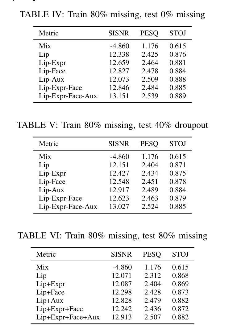 在目标语音提取(TSE)方面,本研究对现实场景中的多变表现提出了深度分析。利用多重模式,例如声音、嘴唇、脸部以及表情嵌入可以增强系统性能。本研究综合分析了在不同模态脱落条件下,多种模态融合策略的互动及稳健性。基于对顶尖视听语音增强系统的研究,本研究融入了四个主要的说话人身份线索,包括同步语境信息的嘴唇嵌入、用于声音一致性的跨注意力语音嵌入、用于身份识别的静态面部嵌入以及用于情绪特征的新动态表情嵌入。实验系统地评估了在两种主要训练方案下不同模态的组合:零脱落率和百分之八十的模态脱落率。大量实验显示,全模态集合在理想条件下(零脱落率)表现最优,但在测试时若发生未受训练的模态脱落现象,其有效性会显著下降。关键的是,训练时采用高模态脱落率(百分之八十)可极大提高模型的稳健性,使系统在测试时即使面临严重缺失模态也能保持卓越性能。本研究发现语音嵌入具有一贯的稳健性,而提出的表现嵌入提供了宝贵的辅助信息。这项研究强调在设计实用可靠的模态语音增强系统时,需超越纯粹的性能最大化考虑现实世界的不完善之处并制定有效的训练策略。