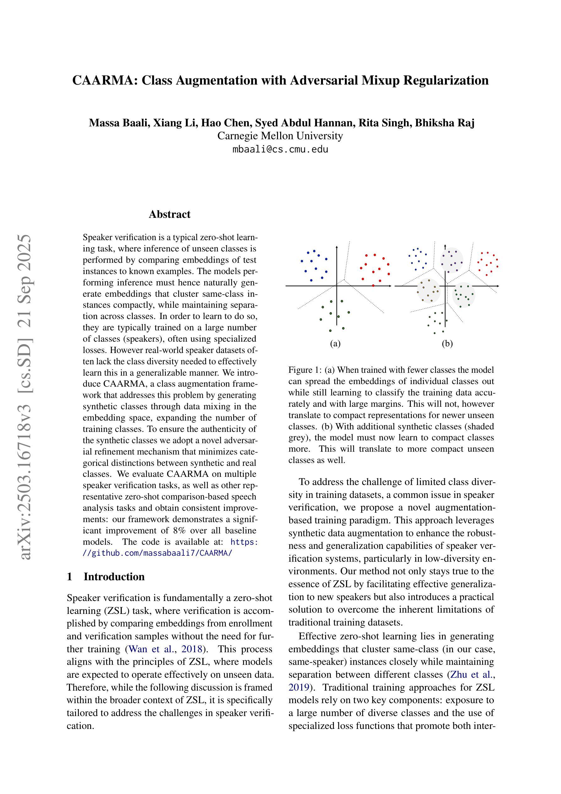 说话人验证是一个典型的零样本学习任务,通过比较测试实例的嵌入和已知示例来进行未见类的推理。因此,执行推理的模型必须自然地生成嵌入,将同类实例紧密聚类,同时保持各类之间的分离。为了学会这样做,它们通常会在大量类别(说话人)上进行训练,常常使用专门的损失函数。然而,现实世界的说话人数据集往往缺乏以通用方式有效学习所需的类别多样性。我们引入了CAARMA,这是一种类扩展框架,通过嵌入空间中的数据混合生成合成类来解决这个问题,扩大了训练类的数量。为了确保合成类的真实性,我们采用了一种新型对抗性改进机制,最小化合成类和真实类之间的类别差异。我们在多个说话人验证任务以及其他具有代表性的基于零样本比较的语音分析任务上评估了CAARMA,并获得了持续性的改进:我们的框架在所有基准模型上实现了8%的显著改进。代码可在以下网址找到:[https://github.com/massabaali7/CAARMA/]