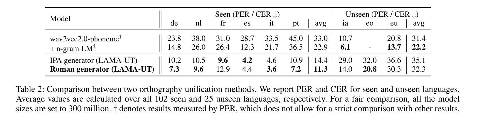 构建一种能在各种语言中表现均衡的通用多语种自动语音识别(ASR)模型一直是一个挑战,因为其固有的难度。为了解决这一任务,我们引入了通过正字法统一和语言特定转写(LAMA-UT)的语言无关多语种ASR管道。LAMA-UT在没有任何语言特定模块的情况下运行,同时匹配在少量数据上训练的最新模型的性能。我们的管道包括两个关键步骤。首先,我们利用通用转录生成器将正字特征统一为罗马化形式,并捕捉不同语言的共同语音特征。其次,我们利用通用转换器将这些通用转录转化为特定语言的转录。在实验中,我们证明了利用通用转录进行大规模多语种ASR的方法的有效性。与whisper相比,我们的管道在相对误差减少率方面实现了45%的降低,并且在仅使用whisper 0.1%的训练数据的情况下,其性能与MMS相当。此外,我们的管道不依赖于任何语言特定的模块,但其性能与零射击ASR方法相当,后者利用额外的语言特定词汇和语言模型。我们希望这个框架能成为灵活的多语种ASR系统的基石,甚至可以对未见过的语言进行推广。