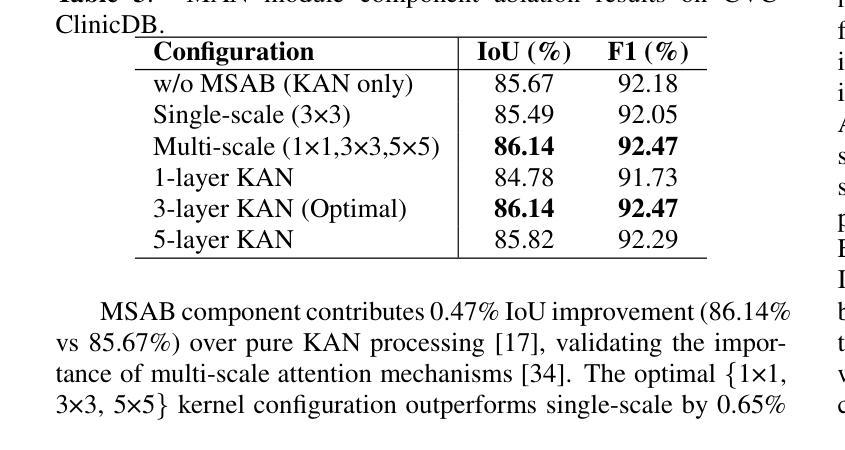 医学图像分割在保留精细粒度和精确边界方面面临着重大挑战,这是由于复杂的解剖结构和病理区域所导致的。这些挑战主要源于传统U-Net架构的两个关键局限性:(1)其简单的跳跃连接忽略了各种特征之间的编码器-解码器语义鸿沟;(2)它们在深层中缺乏多尺度特征提取的能力。为了解决这些挑战,我们提出了具有多尺度自适应KAN(U-MAN)的U-Net,这是一种新型架构,它通过两个专用模块增强了新兴的Kolmogorov-Arnold网络(KAN):渐进式注意力引导特征融合(PAGF)和多尺度自适应KAN(MAN)。我们的PAGF模块使用注意力融合编码器和解码器的特征,替换了简单的跳跃连接。MAN模块使网络能够自适应地处理多尺度特征,提高了分割各种尺寸物体的能力。在BUSI、GLAS和CVC三个公共数据集上的实验表明,U-MAN优于最先进的方法,特别是在定义精确边界和保留细节方面。