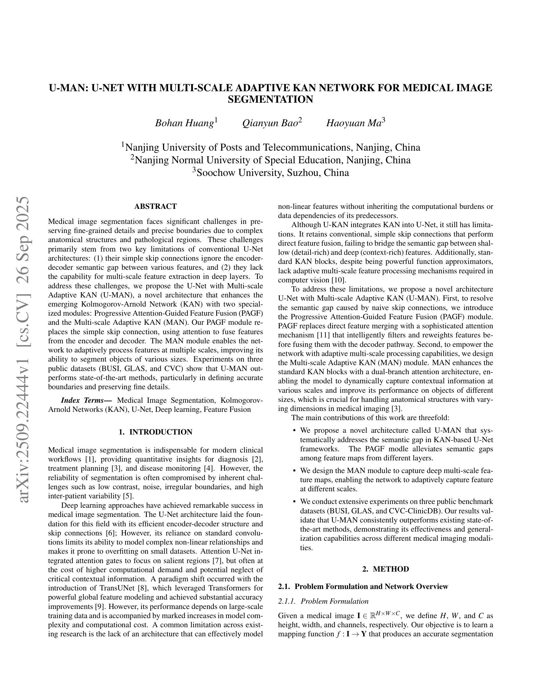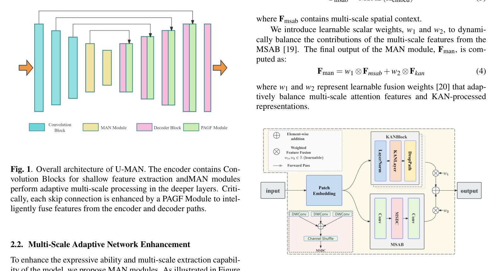 - U-MAN模型结合了Kolmogorov-Arnold网络(KAN)与两个模块:Progressive Attention-Guided Feature Fusion(PAGF)和多尺度自适应KAN(MAN)。