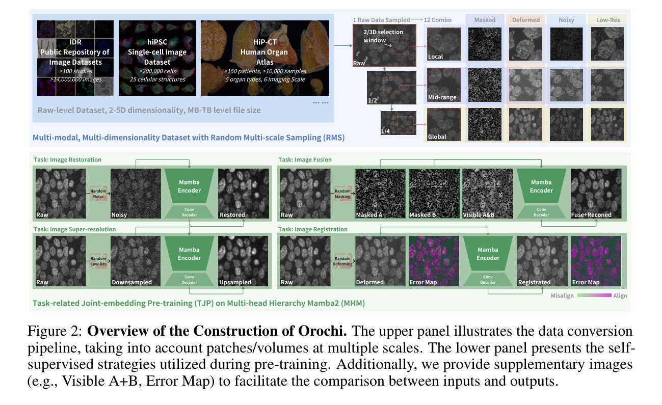 深度学习已成为加速生命科学领域研究的关键工具之一,其在生物医学图像的底层处理(例如注册、融合、修复、超分辨率)方面的应用尤为关键。ImageJ(Fiji)和napari等平台为各种模型定制插件的开发提供了支持。然而,这些插件通常仅限于特定任务和数据集,对于生物学家来说实用性较低。为了应对这一挑战,我们推出了Orochi,这是一款面向应用、高效且通用的图像处理工具,旨在克服这些限制。Orochi采用我们的随机多尺度采样策略,对来自超过100项公开研究的原始数据提取的补丁/体积进行预训练。我们进一步提出了任务相关联合嵌入预训练(TJP),它采用生物医学任务相关退化进行自监督,而不是依赖遮挡图像建模(MIM),后者在注册等下游任务中表现不佳。为了保证计算效率,我们利用Mamba的线性计算复杂性,构建了多头层次Mamba。此外,我们提供了三层微调框架(全面、正常和轻量级),并证明Orochi即使使用轻量级参数高效选项,也能达到或超越当前先进的专业模型性能。我们希望本研究为全集成工作流程的发展做出贡献,从而减轻生物学家在选择众多模型方面的繁重任务。