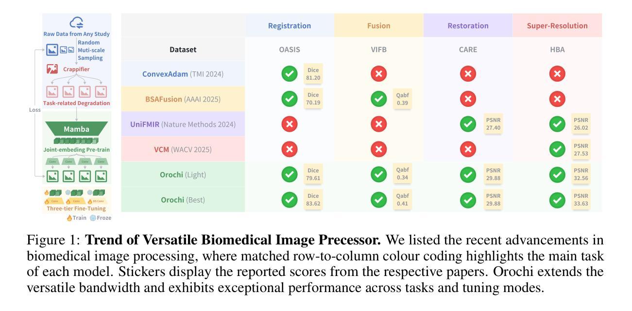 - Orochi是一个针对生物医学图像处理的综合性工具,通过预训练和策略优化提高了对各种任务的适应性。