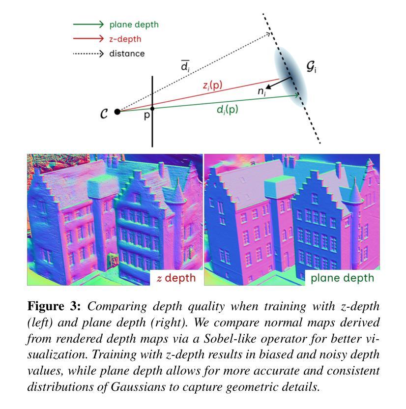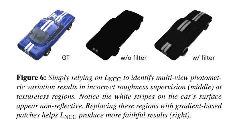 我们提出了一种基于3D高斯拼贴的多视角图像网格重建和材料分解的统一解决方案,称为GS-2M。之前的工作是分别处理这两个任务,并且在重建高反射表面时面临困难,通常依赖外部模型的先验知识来增强分解结果。相反,我们的方法通过联合优化与渲染深度和法线质量相关的属性来解决这两个问题,在保持几何细节的同时,对反射表面具有弹性。虽然当代作品能有效地同时解决这两个任务,但它们通常使用复杂的神经网络组件来学习场景属性,这阻碍了它们在规模上的性能。为了进一步消除这些神经网络组件,我们提出了一种基于多视角光度变化的新型粗糙度监督策略。当与一个精心设计的损失和优化过程相结合时,我们的统一框架产生与最先进的方法相当的重建结果,为下游任务提供三角网格及其相关的材料组件。我们使用之前工作中广泛使用的数据集验证了我们的方法的有效性,并与最先进的表面重建方法进行定性比较。