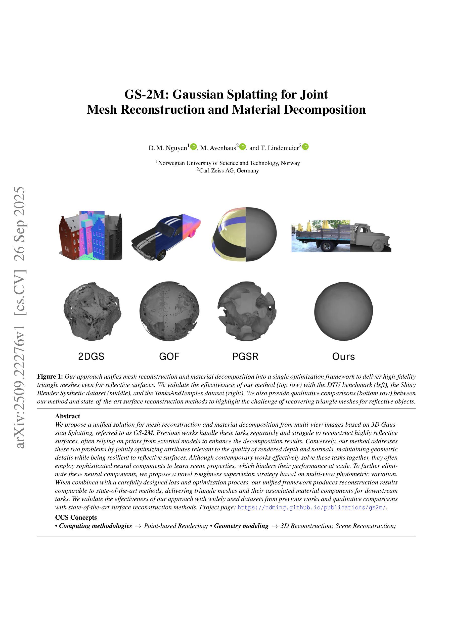 本文提出一种基于三维高斯延展技术的统一解决方案,简称GS-2M,用于从多视角图像进行网格重建和材料分解。该方法通过联合优化与渲染深度和法线质量相关的属性,解决了高度反射表面的重建问题,同时保持几何细节。与传统的独立处理这两个任务的方法相比,GS-2M无需依赖外部模型的先验知识即可提升分解结果。此外,通过采用基于多视角光度变化的新型粗糙度监督策略,该方法可进一步简化复杂的神经网络组件,从而提高性能。实验证明,该方法在广泛使用的数据集上与最先进的重建方法相比具有竞争力,可为下游任务提供三角网格及其相关材料组件。