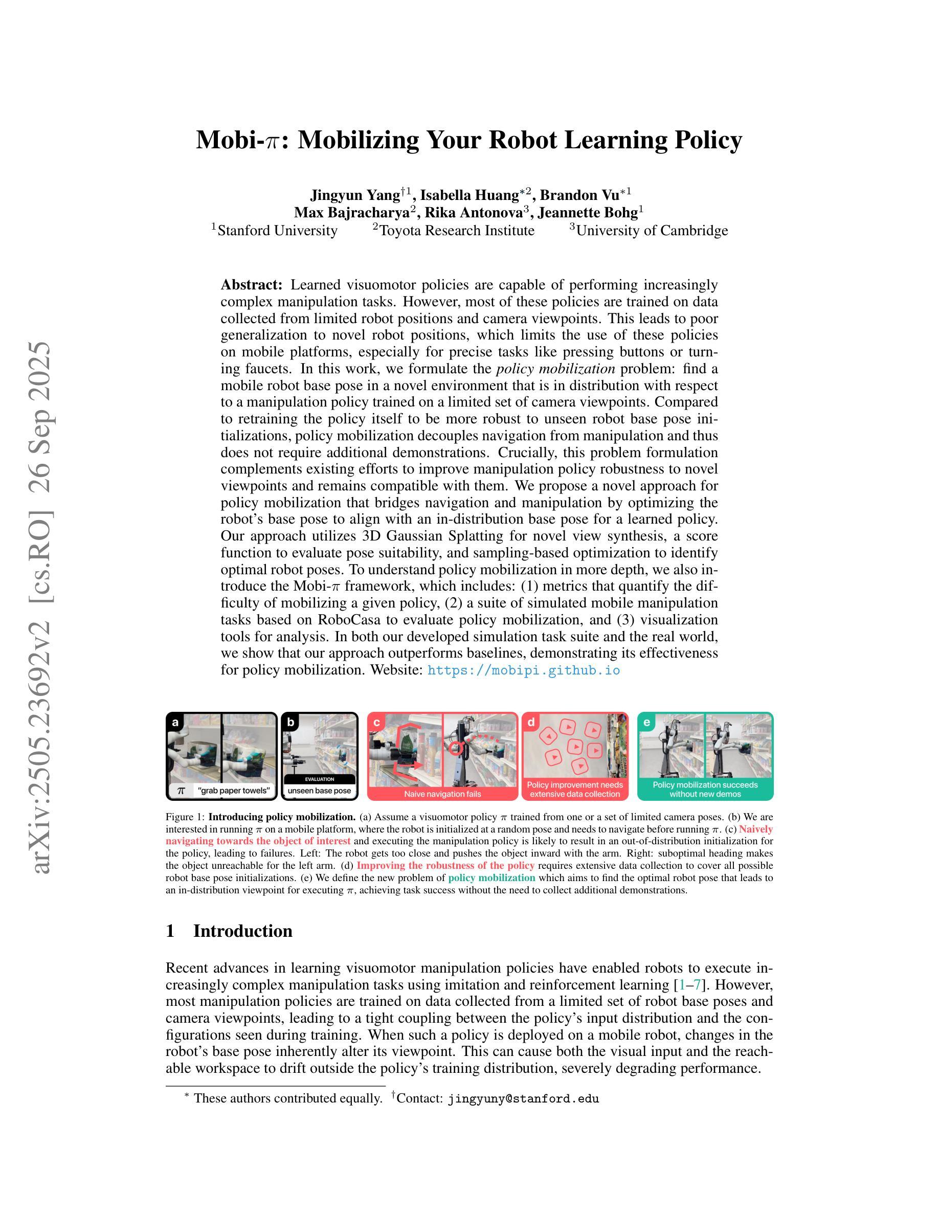 学习到的视觉运动策略能够执行越来越复杂的操作任务。然而,大多数这些策略都是在从有限的机器人位置和摄像头视角收集的数据上进行训练的。这导致了对新的机器人位置的泛化能力较差,从而限制了这些策略在移动平台上的使用,尤其是像按钮或水龙头这样的精确任务。在这项工作中,我们制定了策略动员问题:在一个新环境中找到一个移动机器人基座姿态,使其相对于在有限的摄像头视角集上训练的操纵策略处于分布状态。与重新训练策略本身以使其对看不见的机器人基座姿态初始化更具鲁棒性相比,策略动员将导航与操作解耦,因此不需要额外的演示。关键的是,该问题公式对现有努力形成补充,以提高操纵策略对新型视角的鲁棒性,并仍然与之兼容。我们提出了一种用于策略动员的新方法,它通过优化机器人的基座姿态来与学习的策略的分布基座姿态对齐,从而架起导航与操作之间的桥梁。我们的方法利用三维高斯拼贴进行新视角合成、评分函数来评估姿态的合适性,以及基于采样的优化来确定最佳的机器人姿态。为了更深入地了解策略动员,我们还引入了Mobi-$\pi$框架,其中包括:(1)量化给定策略动员难度的指标,(2)基于RoboCasa的一系列模拟移动操作任务来评估策略动员,(3)分析工具进行数据分析。在我们的开发仿真任务套件和真实世界中,我们的方法都优于基线方法,证明了其在策略动员方面的有效性。