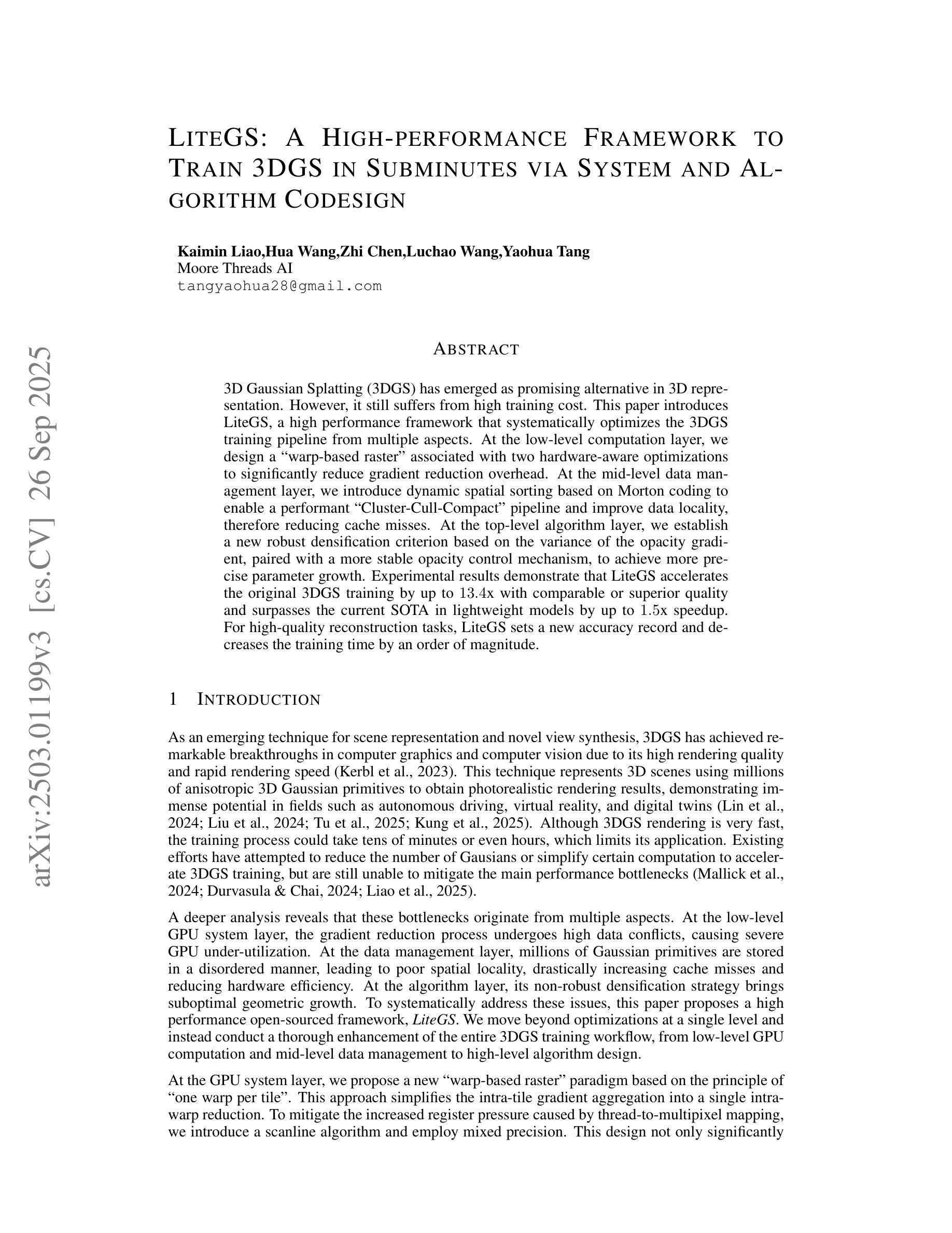3D高斯Splatting(3DGS)作为3D表示的一种有前途的替代方案已经出现。然而,它仍然存在着训练成本高的问题。本文介绍了LiteGS,一个高性能框架,从多个方面系统地优化了3DGS训练管道。在底层计算层,我们设计了一种基于warp的raster,并对其进行两项硬件感知优化,以显著降低梯度缩减的开销。在中层数据管理层,我们引入基于Morton编码的动态空间排序,以实现高效的“Cluster-Cull-Compact”管道,提高数据局部性,从而减少缓存未命中。在顶层算法层,我们建立了一个新的基于不透明度梯度方差稳健的致密化标准,配合更稳定的不透明度控制机制,实现更精确的参数增长。实验结果表明,LiteGS将原始3DGS训练速度提高了高达13.4倍,同时保持或提高了质量,并在轻量级模型上超越了当前最佳水平(SOTA),最高提速达1.4倍。对于高质量重建任务,LiteGS创造了新的精度记录,并将训练时间缩短了一个数量级。