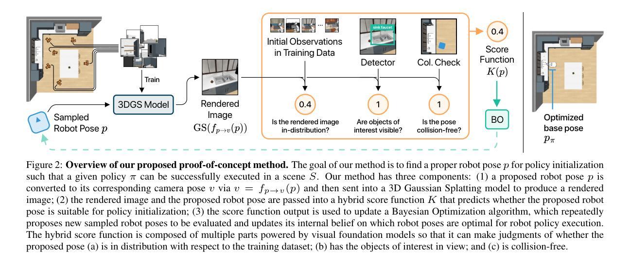 - 利用三维高斯拼接实现新视角合成,采用评分函数和基于采样的优化技术来确定最佳机器人姿态。