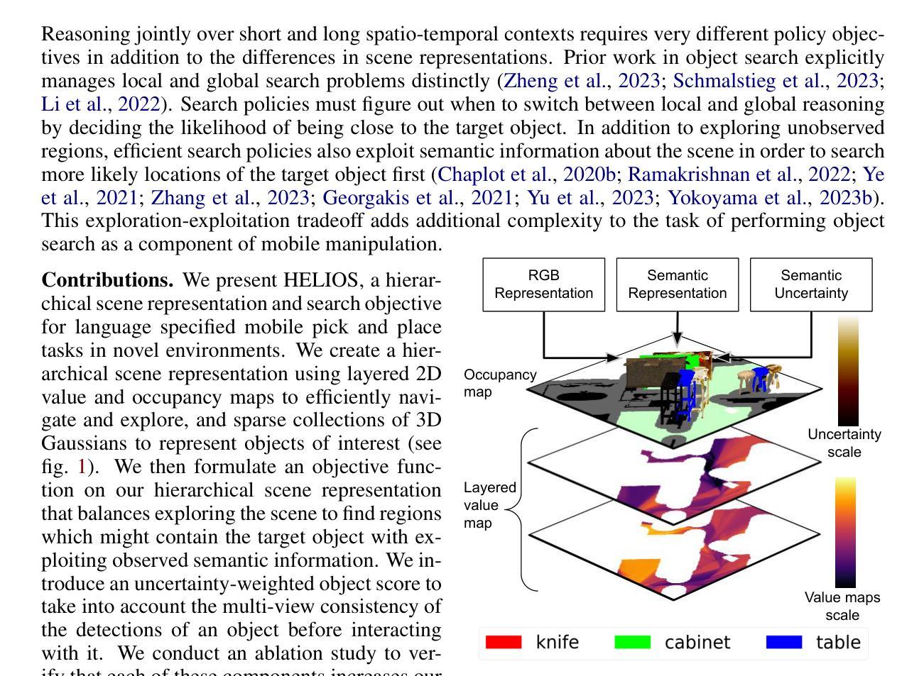 在新型环境中执行特定语言指导的移动操控任务时,同时面临着诸多挑战。这些挑战包括与仅部分观察到的场景进行交互、将语言指令中的语义信息关联到部分观察到的场景,以及通过新观察结果主动更新对场景的认识。为了应对这些挑战,我们提出了HELIOS系统,这是一个层次化的场景表示和相关搜索目标,用于执行特定语言的拾取和放置移动操控任务。我们构建了包含相关语义和占用信息的二维地图,用于导航,同时主动构建任务相关对象的三维高斯表示。我们融合这种多层表示的观测结果,同时显式地建模每个对象检测的视图一致性。为了有效地搜索目标对象,我们制定了一个目标函数,平衡了未观测或不确定区域的探索与场景语义信息的利用。我们在 Habitat 模拟器的 OVMM 基准测试上评估了 HELIOS,这是一个拾取和放置的基准测试,由于场景大而复杂且目标对象相对较小,因此感知具有挑战性。HELIOS 在 OVMM 上达到了最先进的成果。由于我们的方法是零样本方法,HELIOS 还可以在没有额外数据的情况下转移到现实世界。我们通过演示它在真实世界办公室环境中的 Spot 机器人来证明这一点。