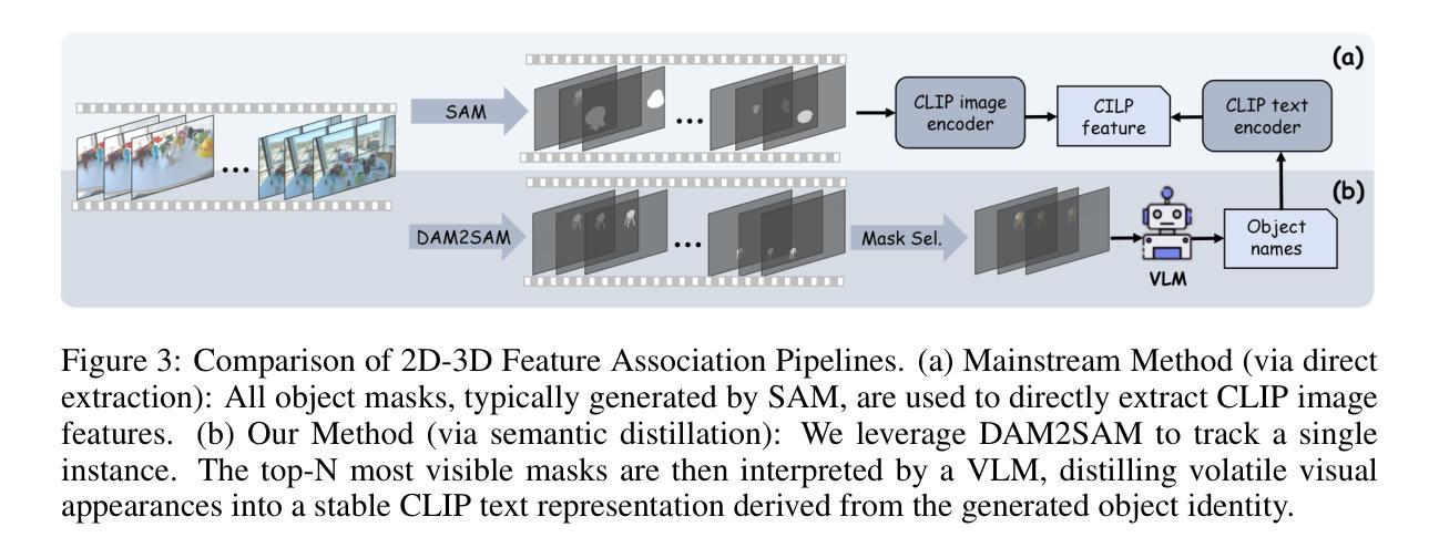 将二维开放词汇理解提升到三维高斯扩展(3DGS)场景是一个关键挑战。然而,主流方法存在三个主要缺陷:(i)它们依赖于昂贵的场景再训练,这阻碍了即插即用应用程序的使用;(ii)其限制性单语义设计无法表示复杂的多概念语义;(iii)它们对跨视图语义不一致的脆弱性会破坏最终语义表示。为了克服这些局限性,我们引入了MUSplat,这是一个无需训练的框架,完全放弃了特征优化。利用预训练的二维分割模型,我们的管道生成并提升多粒度二维蒙版到三维,我们为高斯点中的每个点估计前景概率以形成初始对象组。然后,我们使用语义熵和几何不透明度优化这些初始组的模糊边界。随后,通过解释对象在其最具代表性观点的外观,视觉语言模型(VLM)提炼出稳健的文本特征,解决视觉不一致问题,通过语义匹配实现开放词汇查询。通过消除昂贵的场景训练过程,MUSplat将场景适应时间从数小时缩短到几分钟。在开放词汇三维对象选择和语义分割的基准任务上,MUSplat的表现优于基于训练的框架,同时解决了它们的单语义限制问题。