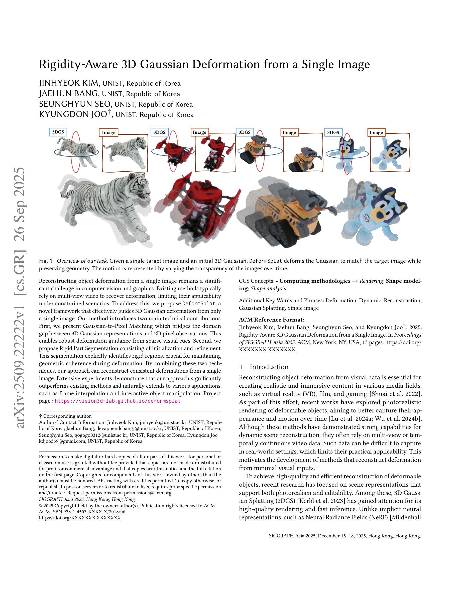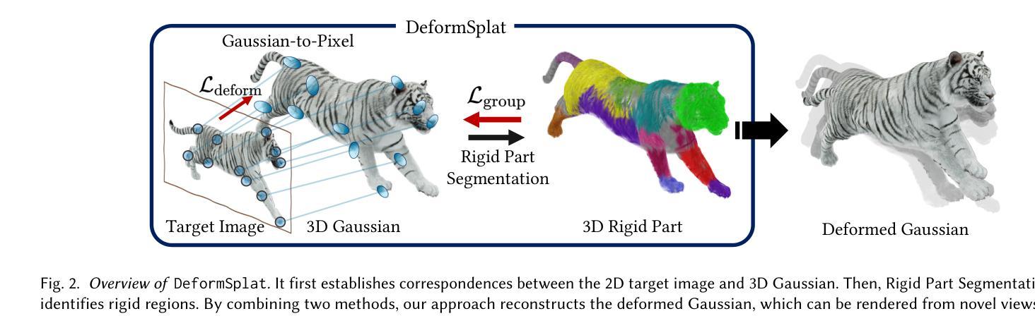 从单一图像重建物体变形在计算机视觉和图形学中仍然是一个巨大的挑战。现有方法通常依赖于多视角视频来恢复变形,这在受限场景下的应用受到局限。为解决此问题,我们提出了DeformSplat,这是一个从单一图像有效引导3D高斯变形的新框架。我们的方法引入了两个主要技术贡献。首先,我们提出了高斯到像素匹配,这缩小了3D高斯表示和2D像素观察之间的领域差距。这可以通过稀疏的视觉线索实现稳健的变形引导。其次,我们提出了刚性部分分割,包括初始化和优化。这种分割明确识别了刚性区域,对于在变形过程中保持几何连贯性至关重要。通过结合这两种技术,我们的方法可以从单一图像重建一致的变形。大量实验表明,我们的方法显著优于现有方法,并自然地扩展到各种应用,如帧内插和交互式对象操作。