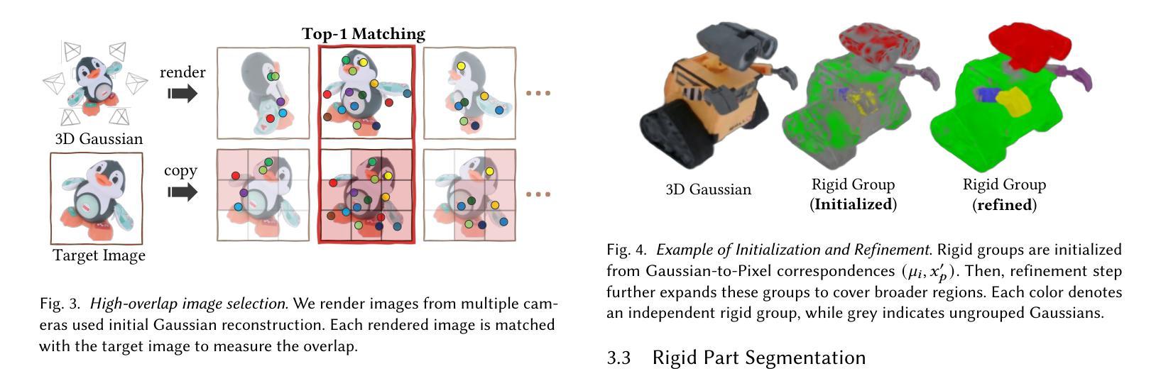 本文提出了一种名为DeformSplat的新型框架,它能从单张图像有效地引导三维高斯变形。该框架包括两个主要技术贡献:一是高斯到像素匹配技术,缩小了三维高斯表示和二维像素观测之间的领域差距,从而实现了从稀疏视觉线索的稳健变形引导;二是刚性部分分割技术,包括初始化和细化,该技术能明确识别刚性区域,对于保持变形过程中的几何一致性至关重要。结合这两项技术,该方法能从单张图像重建出一致的变形。
