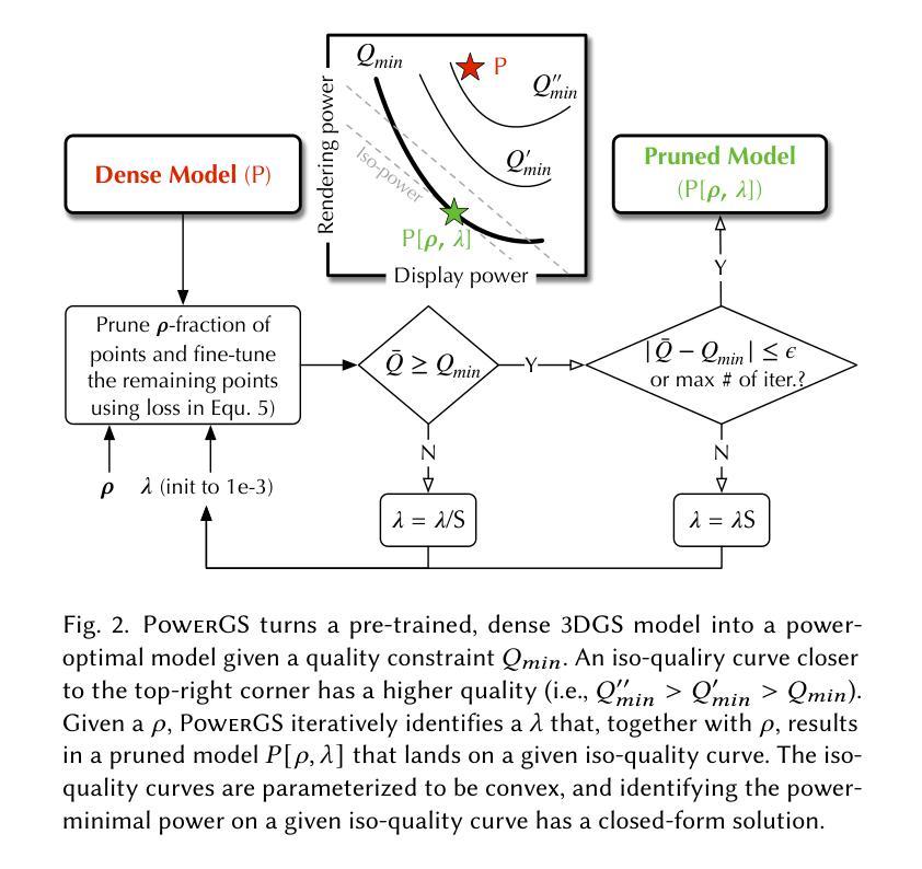 3D高斯贴片(3DGS)结合了基于图像的经典渲染、点基图形和现代化可微技术,为传统基于物理的渲染提供了一种有趣的替代方案。然而,对于功率受限的扩展现实(XR)设备来说,3DGS系列模型效率远远不够,这些设备需要在瓦特级别运行。本文介绍了PowerGS,它是第一个在质量约束下联合最小化渲染和显示功率的框架。我们提出了一个普遍的问题公式,并证明解决问题相当于1)识别由显示和渲染功率所形成的地形中的等质量曲线;2)在给定的曲线上识别功率最小的点,这在曲线适当参数化的情况下具有闭式解。PowerGS也支持快速聚焦渲染以进一步节省功率。广泛的实验和用户研究表明,与最先进的3DGS模型相比,PowerGS在主观和客观质量方面几乎没有损失,总功率降低了高达86%。代码可在https://github.com/horizon-research/PowerGS找到。