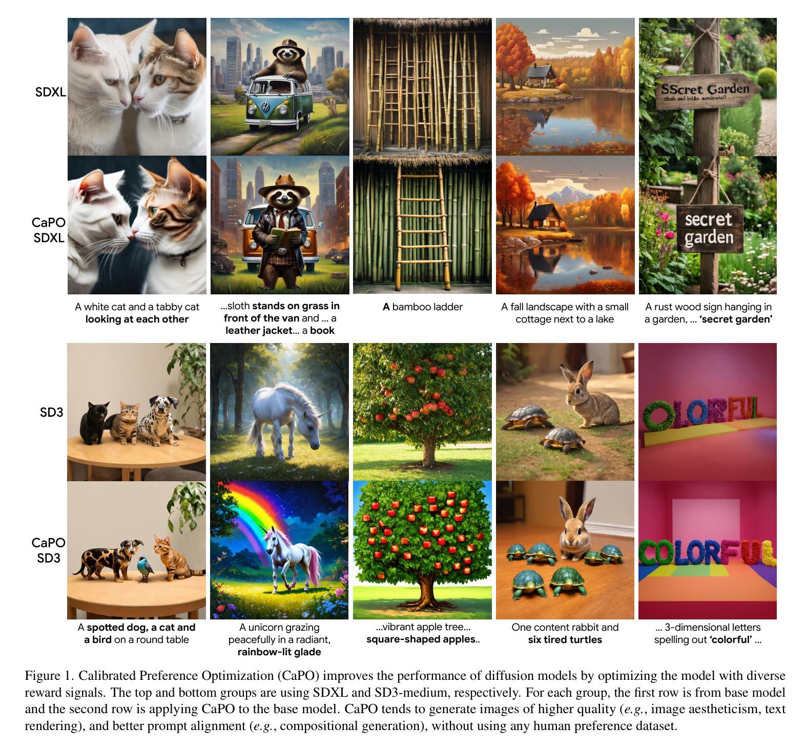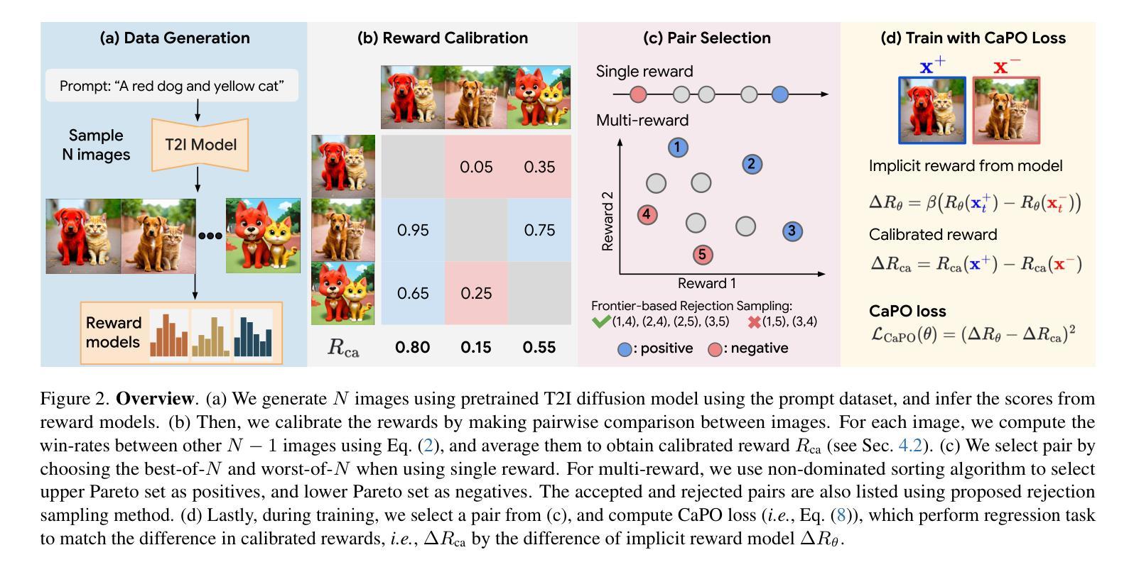 将文本到图像(T2I)扩散模型与偏好优化对齐对于人类注释数据集是有价值的,但手动数据收集的沉重成本限制了可扩展性。使用奖励模型提供了一种替代方案,然而,当前的偏好优化方法未能充分利用丰富信息,因为它们只考虑成对偏好分布。此外,它们缺乏在多种偏好场景下的泛化能力,并且难以处理奖励之间的一致性。为了解决这一问题,我们提出了校准偏好优化(CaPO)这一新方法,通过结合多个奖励模型的通用偏好,无需人类注释数据即可对齐T2I扩散模型。我们的方法的核心在于奖励校准方法,通过计算预训练模型生成的样本的预期胜率来近似通用偏好。此外,我们提出了一种基于前沿的配对选择方法,通过从帕累托前沿选择配对,有效地管理多偏好分布。最后,我们使用回归损失对扩散模型进行微调,以匹配所选配对之间校准奖励的差异。实验结果表明,无论是在单一奖励还是多奖励设置下,经过GenEval和T2I-Compbench评估,CaPO始终优于先前的方法,如直接偏好优化(DPO)。