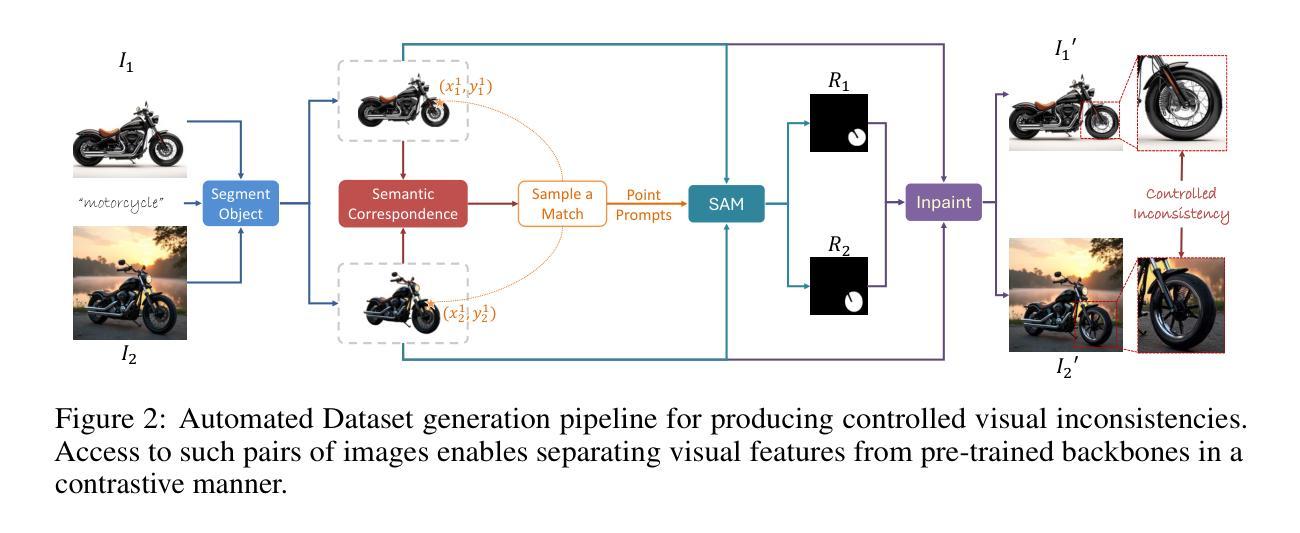 我们提出了一种新型方法,用于从预训练的扩散模型的主干中分离视觉和语义特征,以类似于已建立的语义对应的方式实现视觉对应。虽然已知扩散模型的主干编码了丰富的语义特征,但它们也必然包含视觉特征以支持其图像合成能力。然而,由于缺乏标注数据集,隔离这些视觉特征是一项挑战。为了解决这个问题,我们引入了一个自动化管道,该管道基于现有的主体驱动图像生成数据集构建具有标注语义和视觉对应的图像对,并设计了一种对比架构来分离这两种特征类型。利用解耦的表示形式,我们提出了一种新的度量标准——视觉语义匹配(VSM),用于量化主体驱动图像生成中的视觉不一致性。经验结果表明,我们的方法在量化视觉不一致性方面优于基于全局特征的度量标准,如CLIP、DINO和视觉语言模型,同时能够实现不一致区域的空间定位。据我们所知,这是第一种既支持不一致性的量化又支持定位的主体驱动生成方法,为推进这项任务提供了有价值的工具。项目页面:https://abdo-eldesokey.github.io/mind-the-glitch/