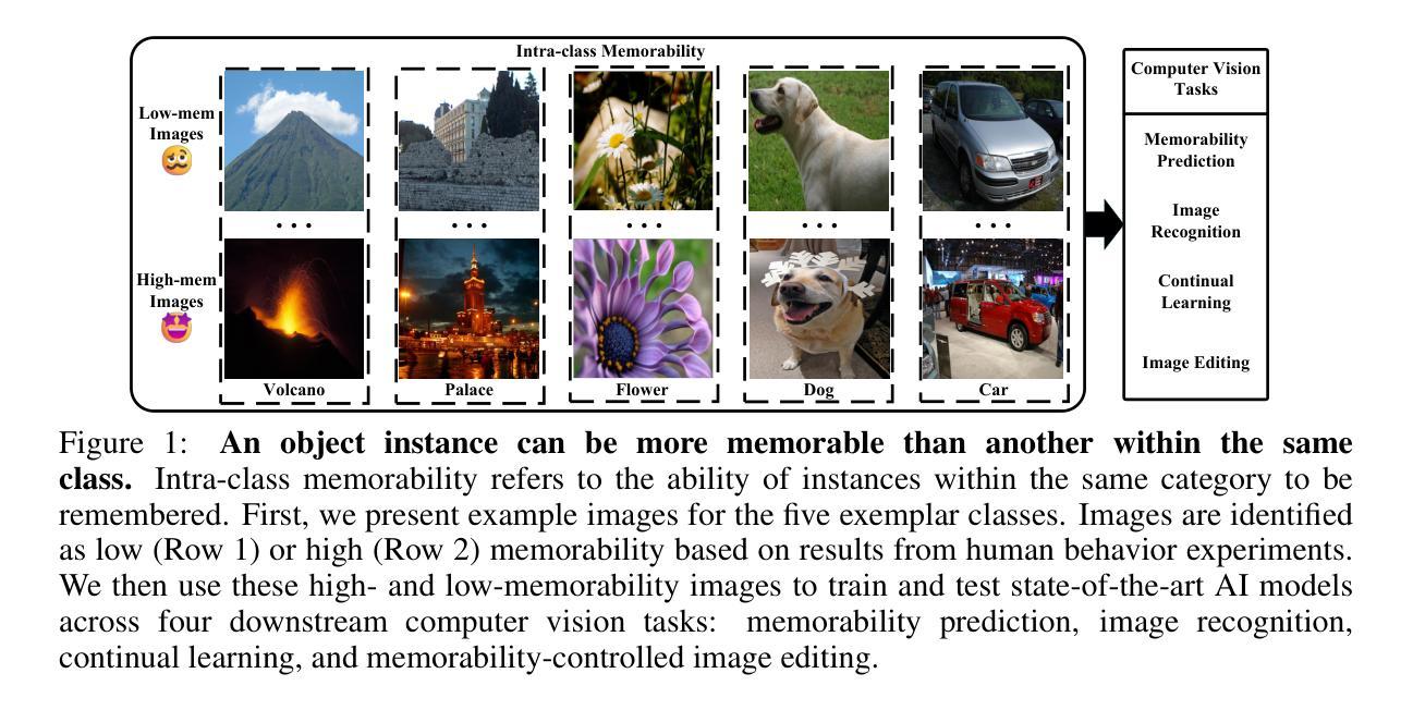 该研究探讨了同一类别内不同图像的记忆性差异,并定义了“类内记忆性”的概念。为了确定使某一对象实例比其他对象更易于记忆的特征,进行了人类行为实验。为此提出量化记忆性的新指标——类内记忆性得分(ICMscore),并建立了包含超过五千张图片的类内记忆性数据集(ICMD)。研究表明,高ICMscore图像会降低AI在图像识别和持续学习任务中的性能,而低ICMscore图像则能提高结果。此外,微调图像扩散模型可用于提高或降低图像记忆性。该研究为理解最难忘和最易忘的图像背后的细微视觉特征以及计算机视觉的潜在应用开辟了新途径。