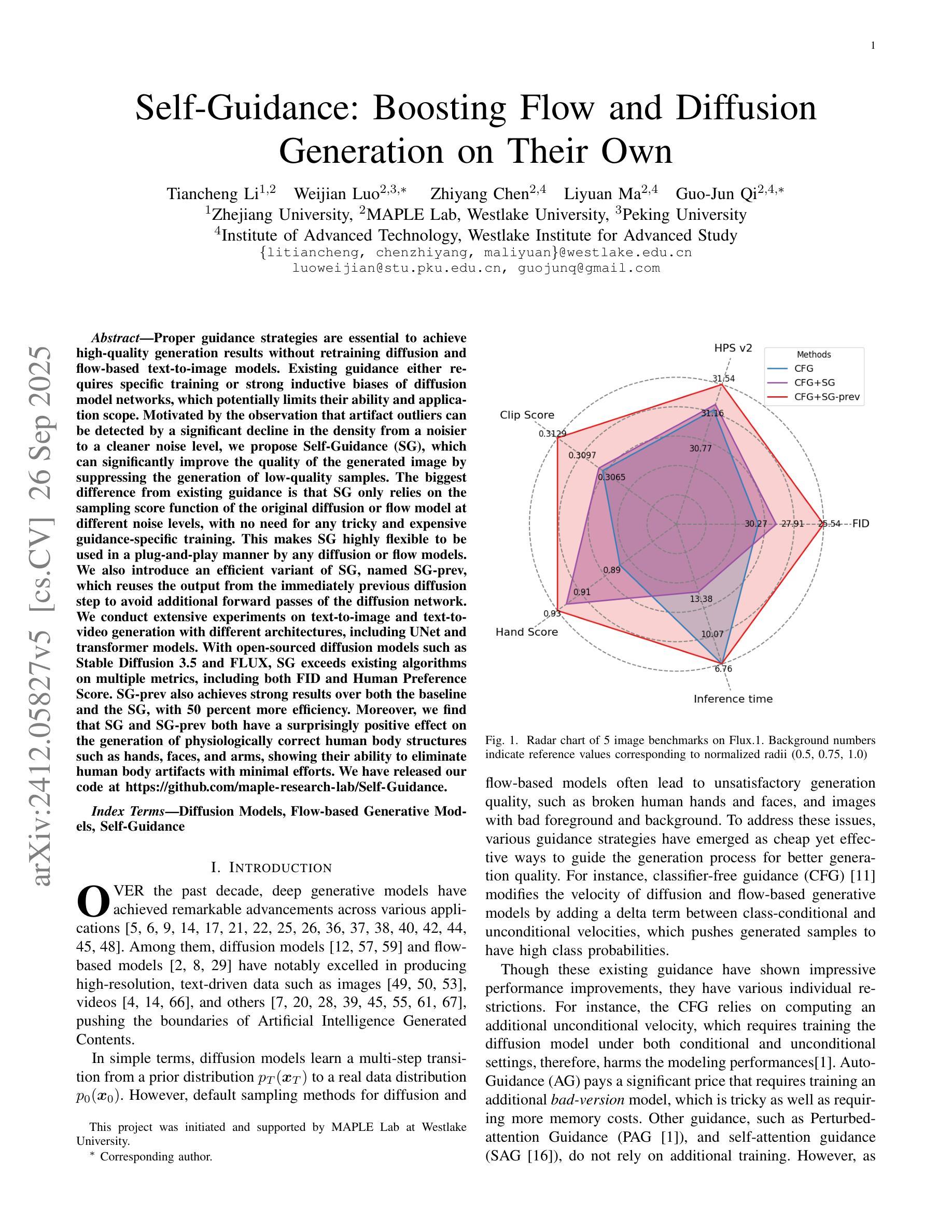 适当的指导策略对于在不重新训练扩散和基于流的文本到图像模型的情况下实现高质量的生成结果至关重要。现有的指导方法要么需要特定的训练,要么需要扩散模型网络的强烈归纳偏见,这可能会限制其能力和应用范围。我们受到观察结果的启发,即可以通过从较嘈杂到较干净噪声水平的密度显着下降来检测异常值,因此提出了自引导(SG),可以通过抑制低质量样本的生成来显着提高生成图像的质量。与现有指导方法最大的不同是,SG仅依赖于不同噪声级别的原始扩散或流模型的采样分数函数,无需任何复杂且昂贵的特定指导训练。这使得SG高度灵活,可以以即插即用方式用于任何扩散或流模型。我们还介绍了SG的一个高效变体,名为SG-prev,它重用前一个扩散步骤的输出,以避免扩散网络的前向传递。我们在不同架构的文本到图像和文本到视频生成上进行了大量实验,包括UNet和transformer模型。使用开源扩散模型(如Stable Diffusion 3.5和FLUX),SG在多个指标(包括FID和人类偏好得分)上超过了现有算法。SG-prev在基准测试和SG方面都取得了强大结果,并且效率提高了50%。此外,我们发现SG和SG-prev在对生理上正确的人类身体结构(如手、脸和手臂)的生成方面产生了令人惊讶的积极影响,显示出它们以最小的努力消除人体伪影的能力。我们的代码已发布在https://github.com/maple-research-lab/Self-Guidance。