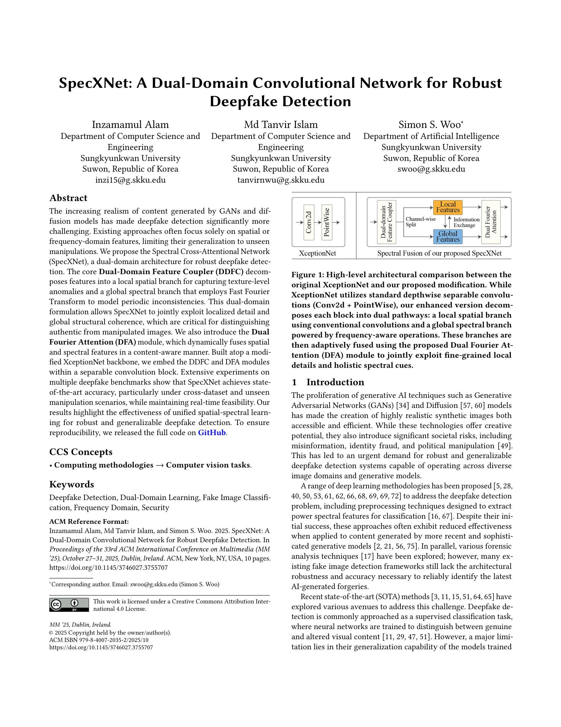 由GAN和扩散模型生成的内容日益逼真的现实情况使得深度伪造检测面临更大的挑战。现有方法通常仅专注于空间或频域特征,这限制了它们对未见操作的泛化能力。我们提出了谱交叉注意力网络(SpecXNet),这是一种用于稳健深度伪造检测的双域架构。其核心双域特征耦合器(DDFC)将特征分解为局部空间分支,用于捕捉纹理级别的异常,和全局谱分支,该分支利用快速傅里叶变换来模拟周期性不一致。这种双域公式使SpecXNet能够共同利用局部细节和全局结构一致性,这对于区分真实图像和操纵过的图像至关重要。我们还引入了双傅里叶注意力(DFA)模块,它以内容感知的方式动态融合空间和谱特征。建立在修改后的XceptionNet主干之上,我们在可分离卷积块中嵌入了DDFC和DFA模块。在多个深度伪造基准测试上的广泛实验表明,SpecXNet达到了最先进的精度,特别是在跨数据集和未见操作场景中,同时保持了实时可行性。我们的结果突显了统一的空间-谱学习的有效性,可实现稳健且可泛化的深度伪造检测。为确保可重复性,我们已在GitHub上发布了完整的代码:[链接](具体链接需替换为实际的GitHub链接地址)。