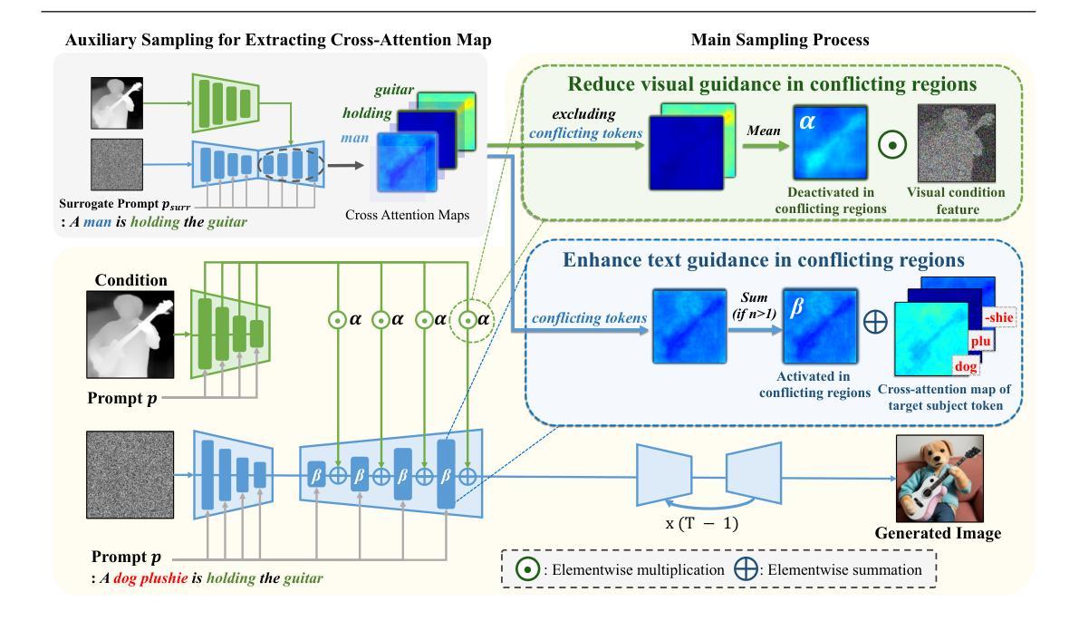 - 最后的排序条件被输入到并行多控制适配器中,该适配器从动态视觉条件学习特征映射并将其整合到ControlNet中,从而提高对生成图像的控制能力。