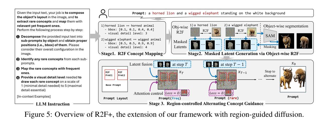 先进的文本到图像(T2I)扩散模型在生成罕见概念组合(例如具有不寻常属性的物体)时经常面临挑战。在本文中,我们展示了通过大型语言模型(LLM)的指导,可以显著增强扩散模型在这种罕见概念上的组合生成能力。我们从实证和理论分析开始,证明在扩散采样过程中暴露与目标罕见概念相关的频繁概念,可以产生更精确的概念组合。基于此,我们提出了一种无需训练的方法R2F,它利用LLM中丰富的语义知识,通过扩散推断,规划和执行从罕见到频繁的整体概念指导。我们的框架适用于任何预训练的扩散模型和LLM,并且可以与区域引导扩散方法无缝集成。在包括我们新提出的基准测试数据集RareBench在内的三个数据集上进行的大量实验表明,R2F在各种包含罕见概念组合的提示下,显著超越了SD3.0和FLUX模型,在T2I对齐方面的性能提高了高达28.1%。代码可在https://github.com/krafton-ai/Rare-to-Frequent找到。