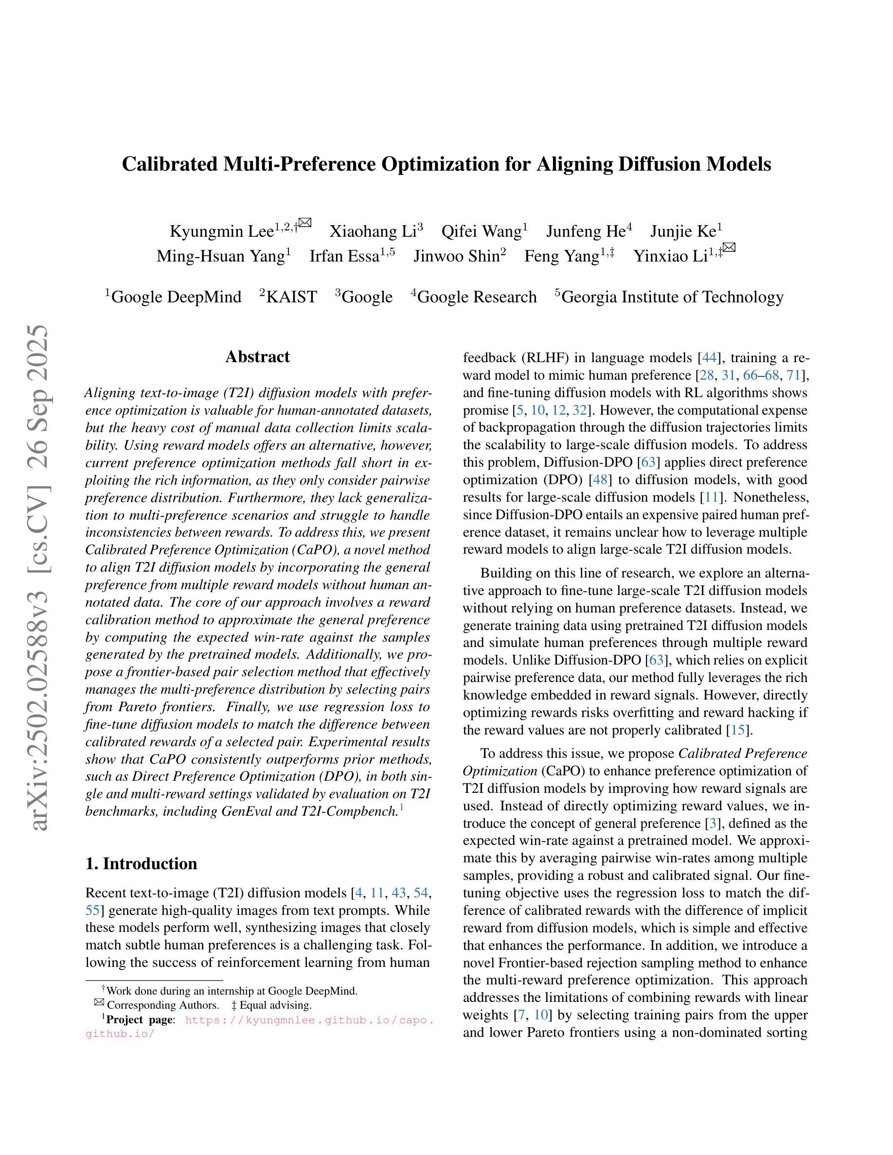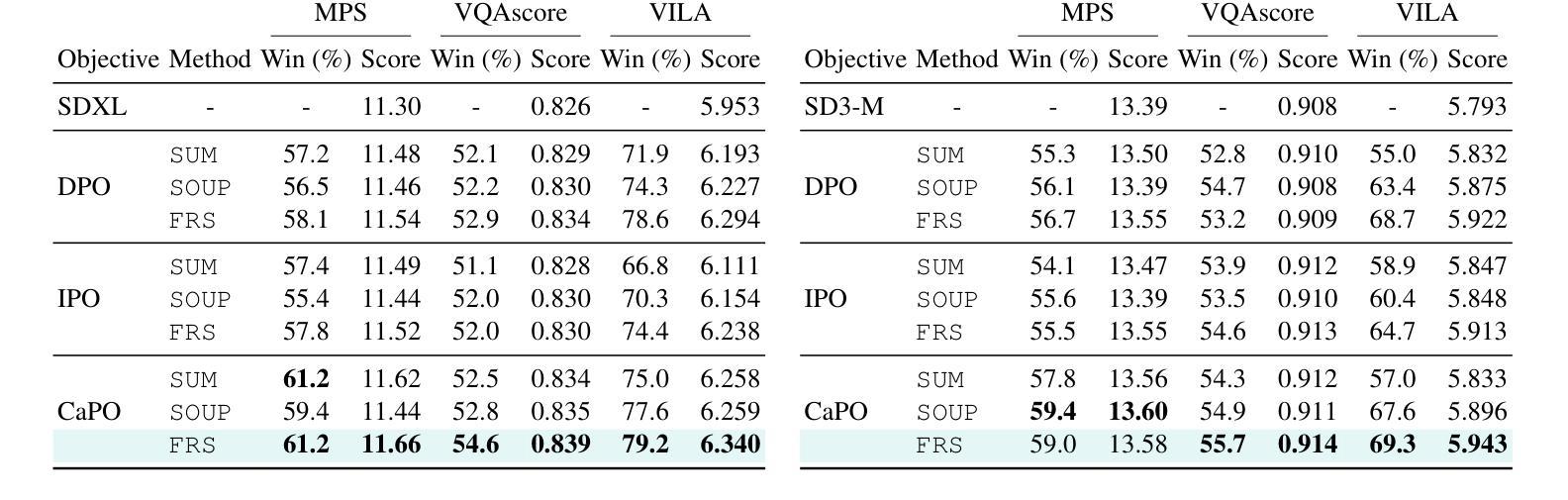 本文提出一种无需人工标注数据的方法,即通过融合多个奖励模型的一般偏好,对文本到图像(T2I)扩散模型进行校准优化(CaPO)。该方法的核心包括奖励校准方法,用于计算预训练模型生成的样本的预期胜率,从而近似一般偏好;同时提出基于前沿的配对选择方法,有效管理多偏好分布;最后通过回归损失微调扩散模型,匹配选定配对的校准奖励差异。实验结果显示,CaPO在单奖励和多奖励设置下均优于先前的优化方法,如直接偏好优化(DPO),并在T2I基准测试中得到了验证。
