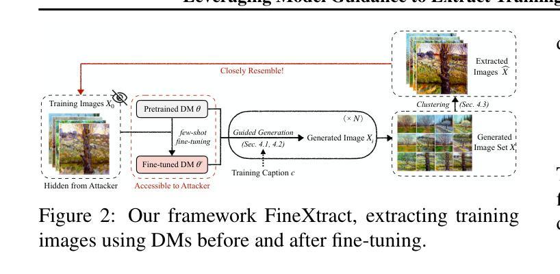 扩散模型(DMs)已成为强大的图像生成工具,特别是在小样本微调中,预训练的DM被微调以捕捉特定的风格或对象。许多人在线上传这些个性化的检查点,促进了如Civitai和HuggingFace等社区的发展。然而,在发布微调检查点时,模型所有者可能会忽略数据泄露的风险。此外,当未经授权的数据用于微调时,就会出现版权违规的担忧。在本文中,我们提出的问题是:“可以从在线共享的这些微调过的扩散模型中提取训练数据吗?”成功的提取不仅会带来数据泄露的威胁,而且也会提供版权侵权的切实证据。为了回答这个问题,我们提出了FineXtract,一个用于提取微调数据的框架。我们的方法将微调近似为模型学习分布的一个逐渐变化——从原始的预训练DM向微调数据转变。通过对微调前后的模型进行外推,我们引导生成向微调数据分布中的高概率区域。然后,我们应用聚类算法从这些使用外推指导生成的图像中提取最可能的图像。在使用WikiArt、DreamBooth和在线发布的现实世界检查点等数据集进行微调的DM上的实验验证了我们方法的有效性,在大多数情况下,能够提取约20%的微调数据。代码可在链接中找到。
