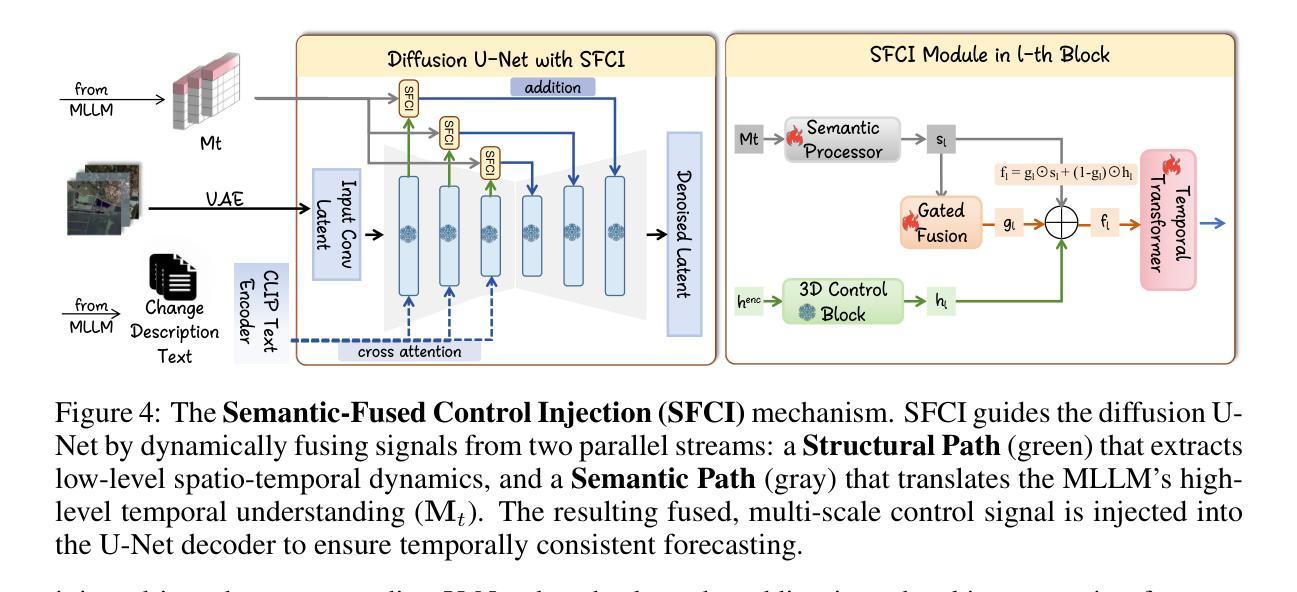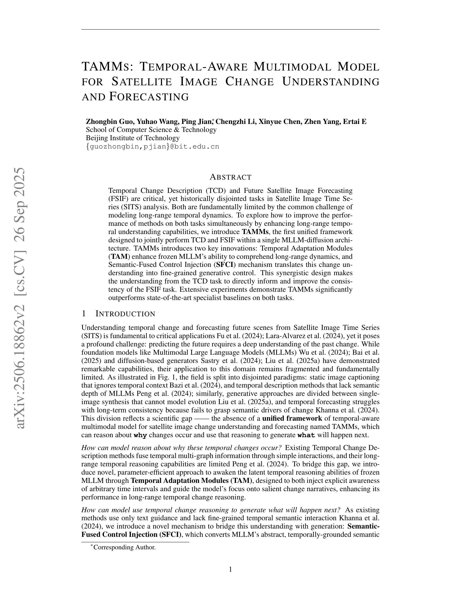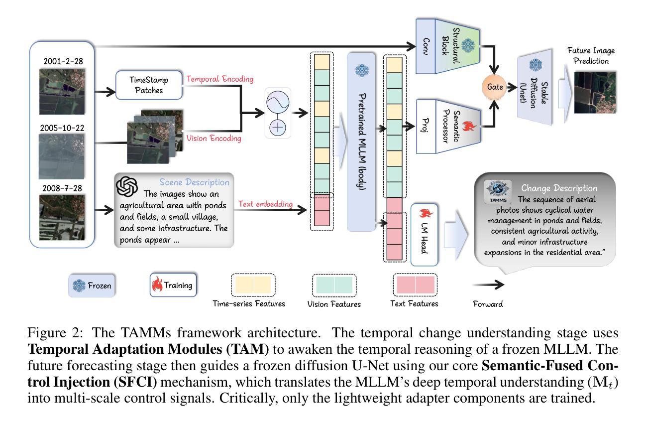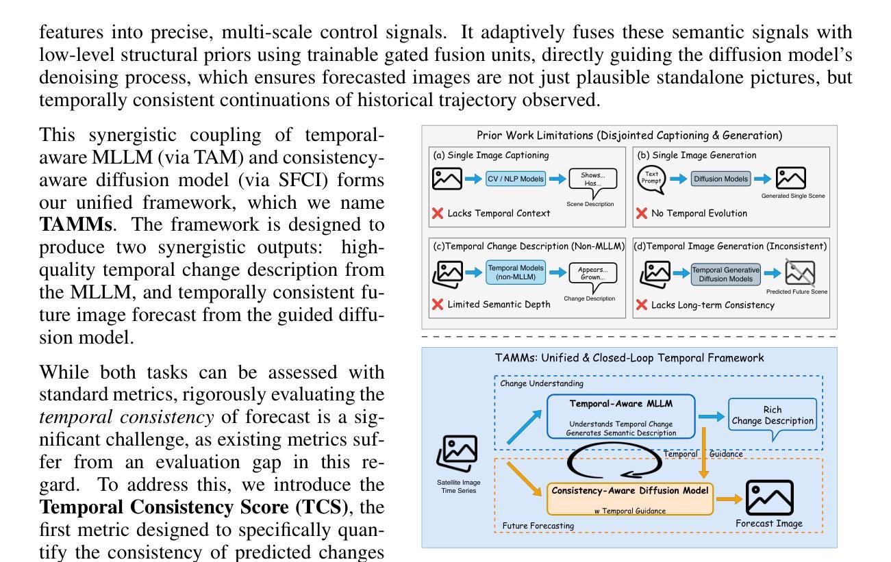 时间变化描述(TCD)和未来卫星图像预测(FSIF)是卫星图像时间序列(SITS)分析中的关键任务,但它们在历史上是相互分离的任务。两者的根本局限性在于模拟长期时间动态的共同挑战。为了探索如何通过提高长期时间理解的能力,同时提高这两种任务方法的性能,我们引入了TAMMs,这是一个统一框架,旨在在一个MLLM扩散架构内同时执行TCD和FSIF。TAMMs引入了两个关键创新点:时间适应模块(TAM)增强了冻结的MLLM对长期动态的理解能力,语义融合控制注入(SFCI)机制将这种变化理解转化为精细的生成控制。这种协同设计使得从TCD任务的理解能够直接为FSIF任务提供信息并提高其一致性。大量实验表明,在两项任务上,TAMMs都显著优于最新的专业基线模型。