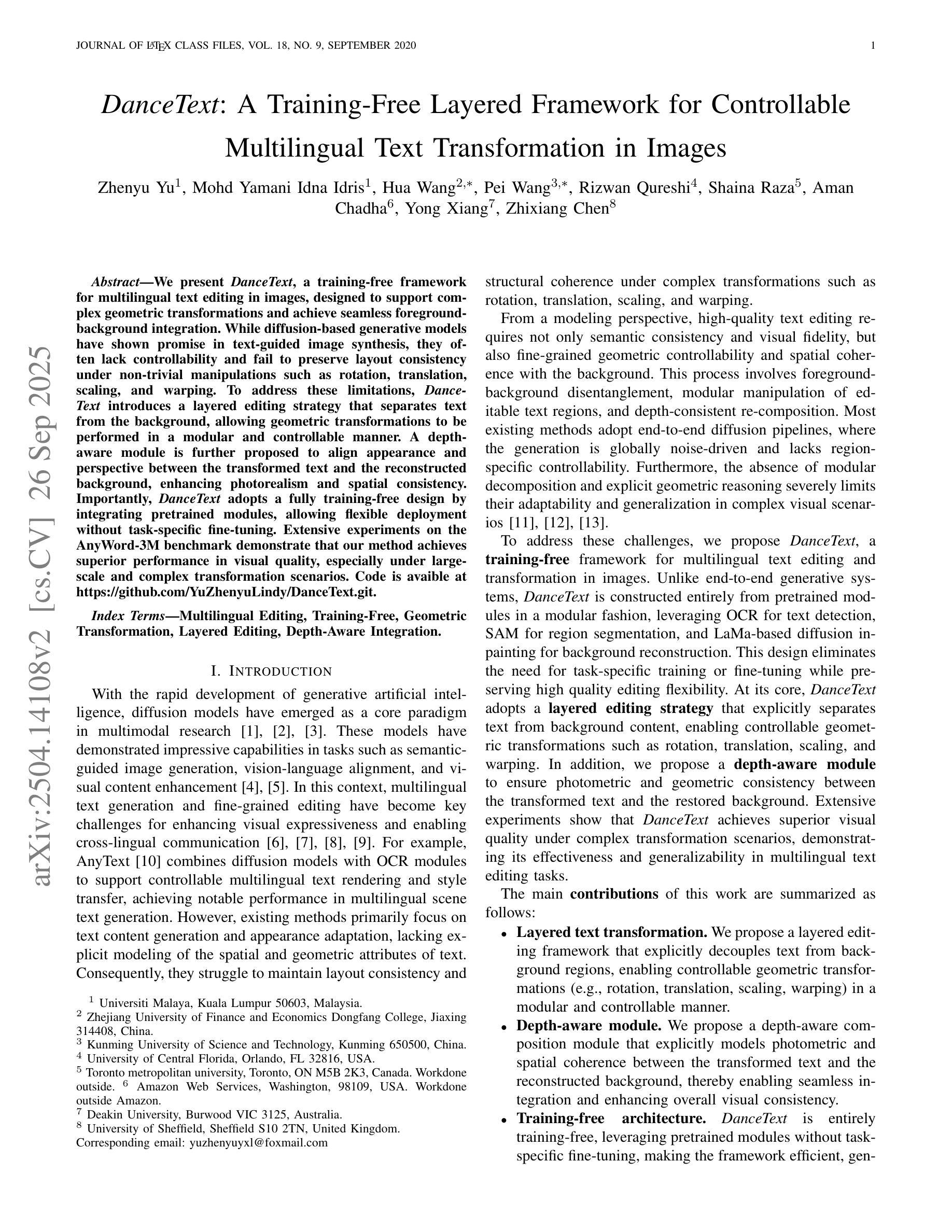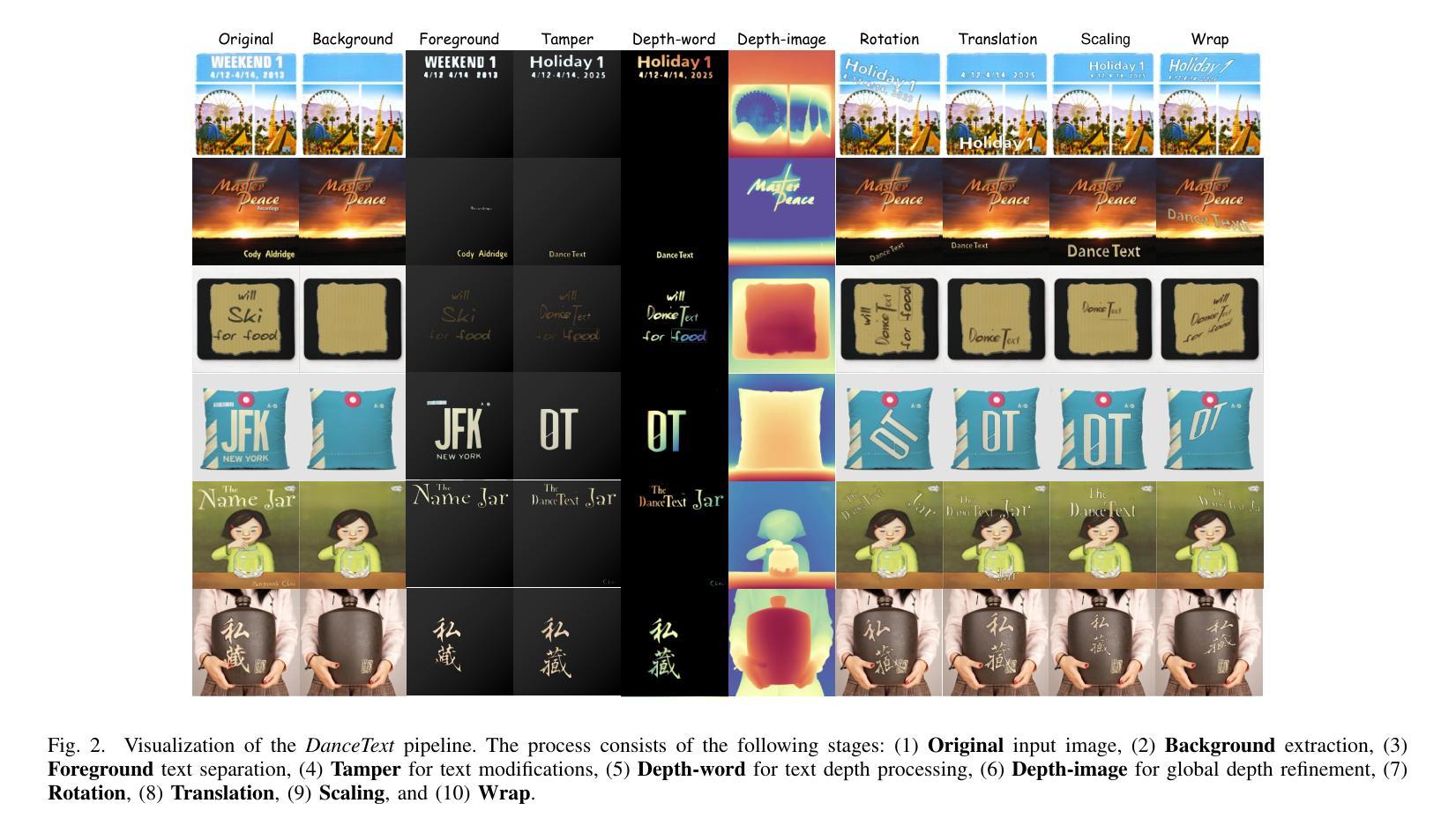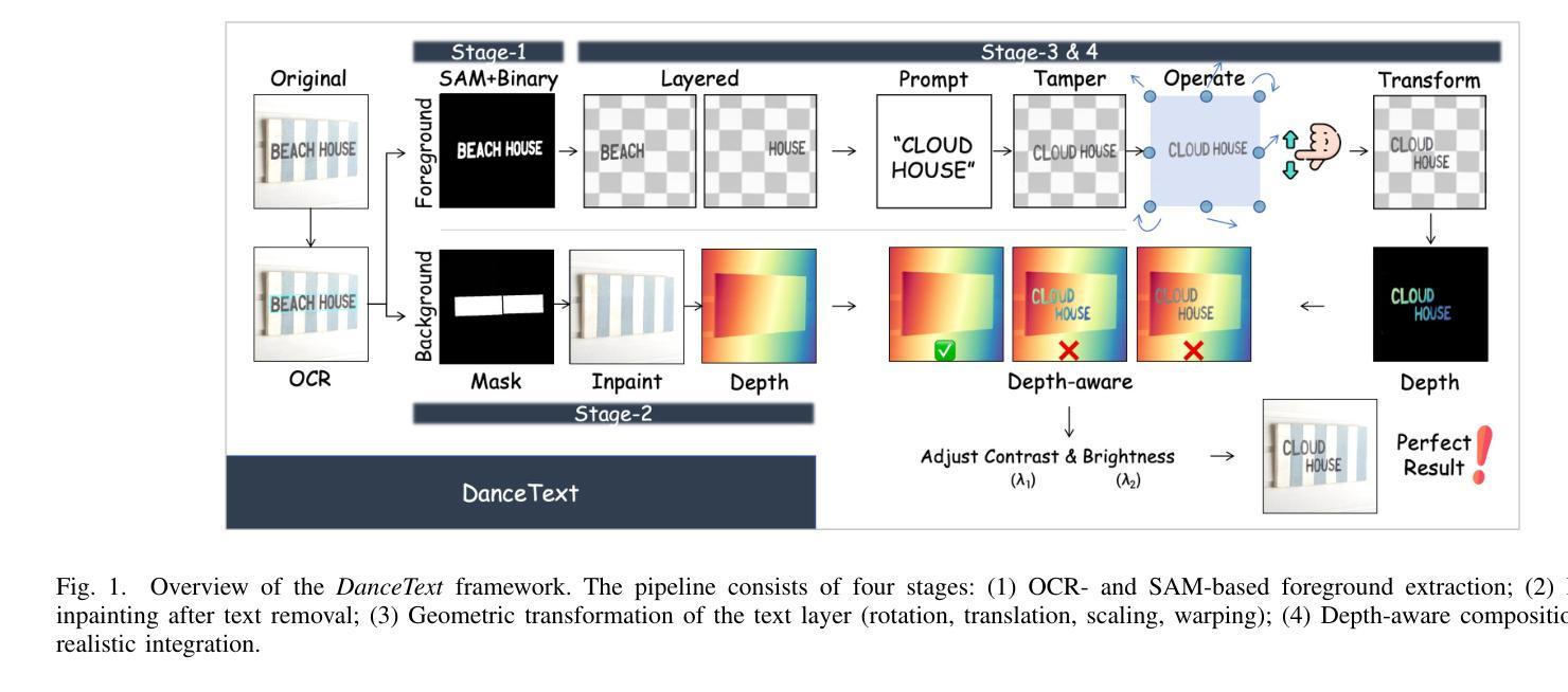 我们推出了DanceText,这是一个用于图像中多语言文本编辑的无训练框架,旨在支持复杂的几何变换,并实现无缝的前景-背景集成。虽然基于扩散的生成模型在文本引导的图像合成中显示出潜力,但它们往往缺乏可控性,在非平凡操作(例如旋转,平移,缩放和弯曲)下无法保持布局一致性。为了解决这些局限性,DanceText引入了一种分层编辑策略,将文本与背景分开,以模块化和可控的方式执行几何变换。还提出了深度感知模块,以在变换的文本和重建的背景之间对齐外观和透视,增强逼真度和空间一致性。重要的是,DanceText通过集成预训练模块采用了完全无训练的设计,无需特定任务的微调即可灵活部署。在AnyWord-3M基准测试的大量实验表明,我们的方法在视觉质量方面实现了卓越的性能,尤其是在大规模和复杂变换场景下。代码可在https://github.com/YuZhenyuLindy/DanceText.git上找到。