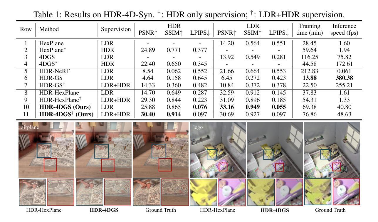 - 大量实验证明,HDR-4DGS在定量性能和视觉保真度上均超越了现有技术。