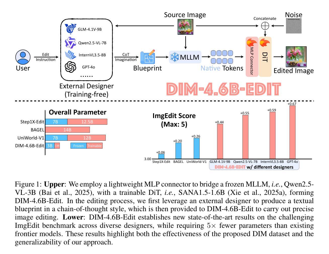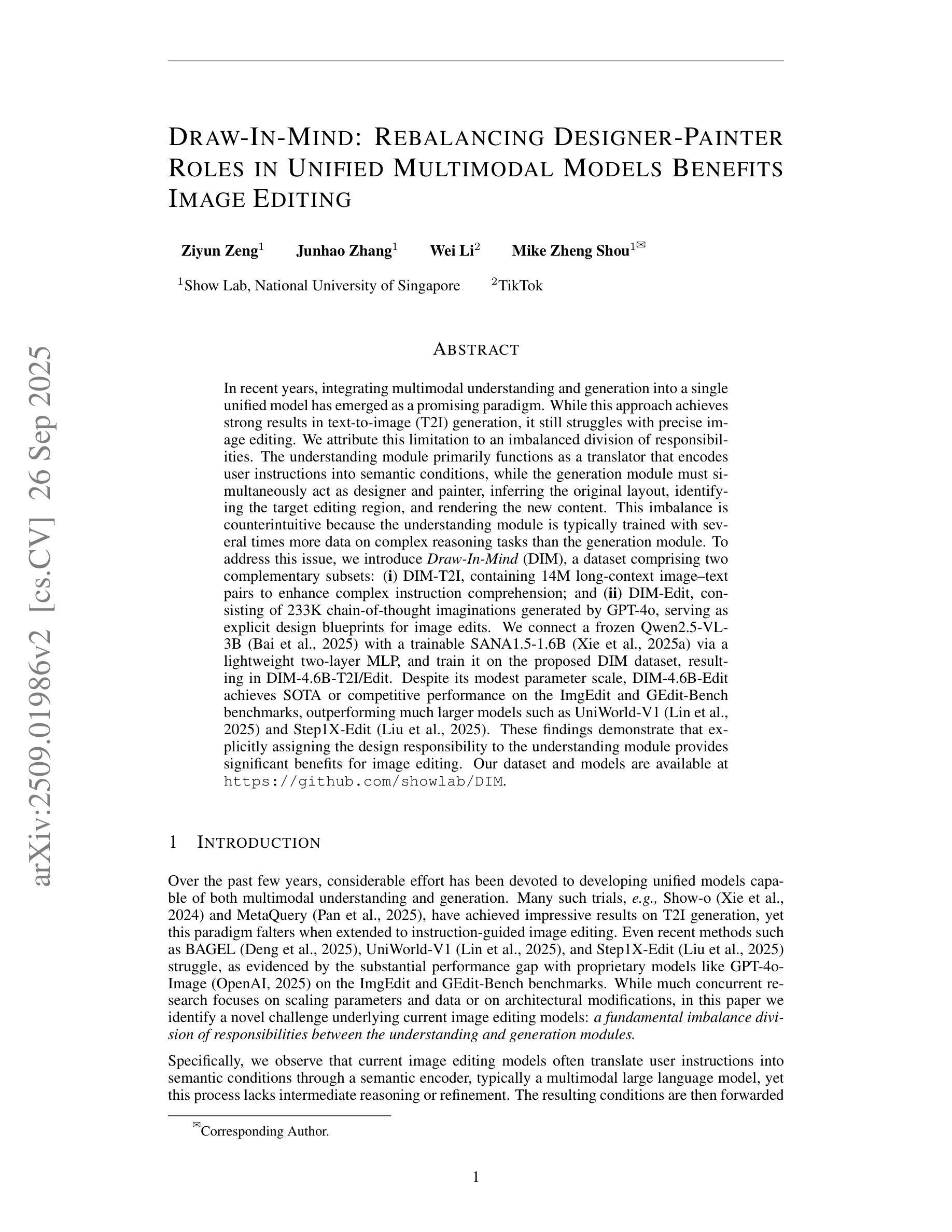 近年来,将多模态理解和生成集成到一个单一统一模型中已成为一种有前途的范式。虽然这一方法在文本到图像(T2I)生成方面取得了很好的效果,但在精确图像编辑方面仍面临挑战。我们将这一局限性归因于责任划分的不平衡。理解模块主要充当将用户指令编码为语义条件的翻译器,而生成模块必须同时充当设计师和画家,推断原始布局,识别目标编辑区域,并呈现新内容。这种不平衡有些反直觉,因为理解模块通常使用更多关于复杂推理任务的数据进行训练,相比之下生成模块则较少。为了解决这个问题,我们引入了Draw-In-Mind(DIM)数据集,它包含两个互补的子集:(i)DIM-T2I,包含14M长上下文图像文本对,用于增强复杂指令理解;(ii)DIM-Edit,由GPT-4o生成的包含233K思维链的想象图像,作为图像编辑的明确设计蓝图。我们通过轻量级的两层MLP将冷冻的Qwen2.5-VL-3B与可训练的SANA1.5-1.6B连接起来,并在提出的DIM数据集上进行训练,得到DIM-4.6B-T2I/Edit模型。尽管其参数规模适中,但DIM-4.6B-Edit在ImgEdit和GEdit-Bench基准测试中实现了SOTA或具有竞争力的性能表现,超越了诸如UniWorld-V1和Step1X-Edit等大型模型。这些发现表明,明确地将设计责任分配给理解模块对于图像编辑具有显著益处。我们的数据集和模型可以在https://github.com/showlab/DIM处获得。
