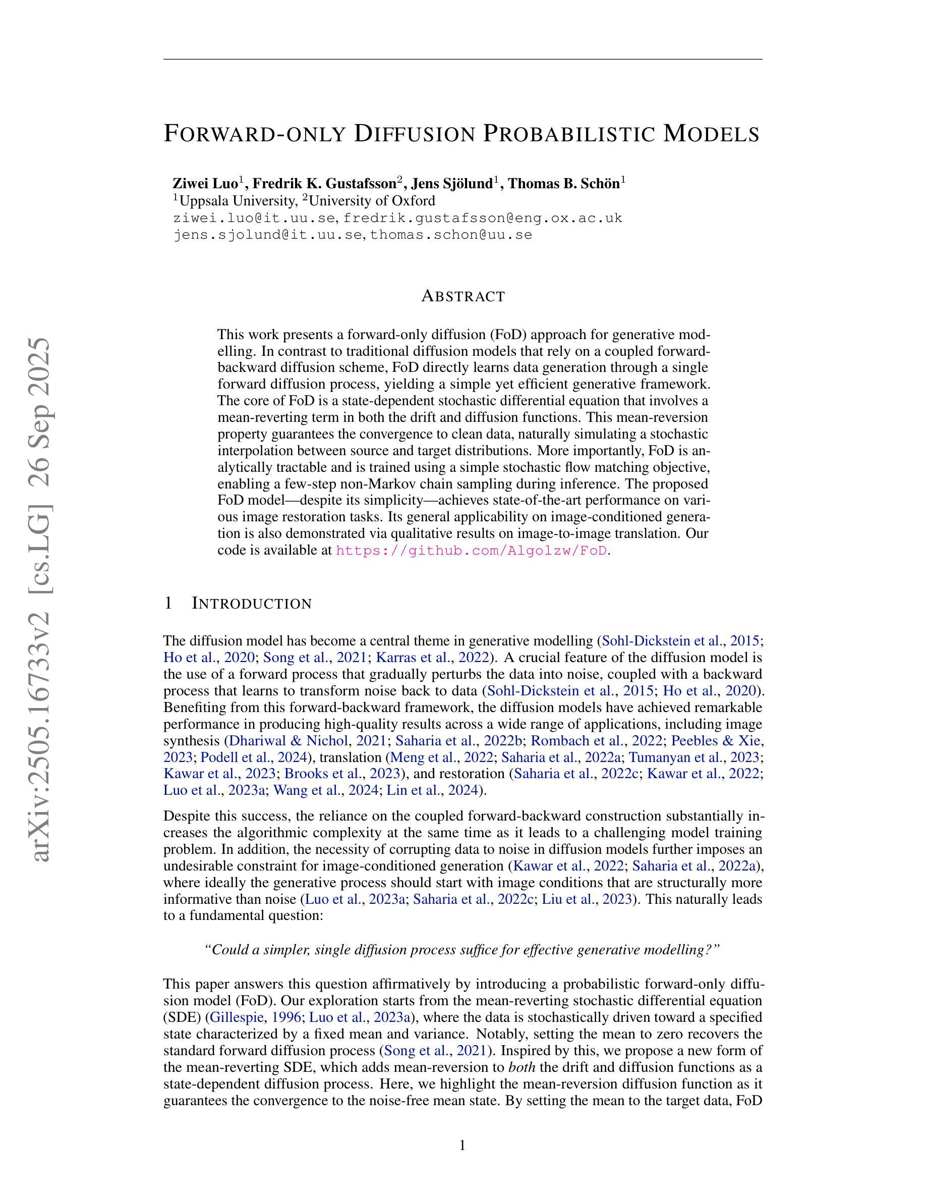 此工作提出了一种仅前向扩散(FoD)的生成建模方法。与传统的采用耦合的前向-后向扩散方案的扩散模型不同,FoD通过单一的前向扩散过程直接学习数据生成,提供了一个简洁而高效的生成框架。FoD的核心是一个涉及均值回归项的态依赖随机微分方程,该方程在漂移和扩散函数中均有体现。均值回归属性保证了向清洁数据的收敛,自然地模拟了源分布和目标分布之间的随机插值。更重要的是,FoD具有分析上的可行性,并使用简单的随机流匹配目标进行训练,使得在推理过程中实现了几步非马尔可夫链采样。尽管其简洁性,FoD在各种图像恢复任务上达到了最先进的性能,并且在图像到图像的转换上通过定性结果证明了其普遍适用性。