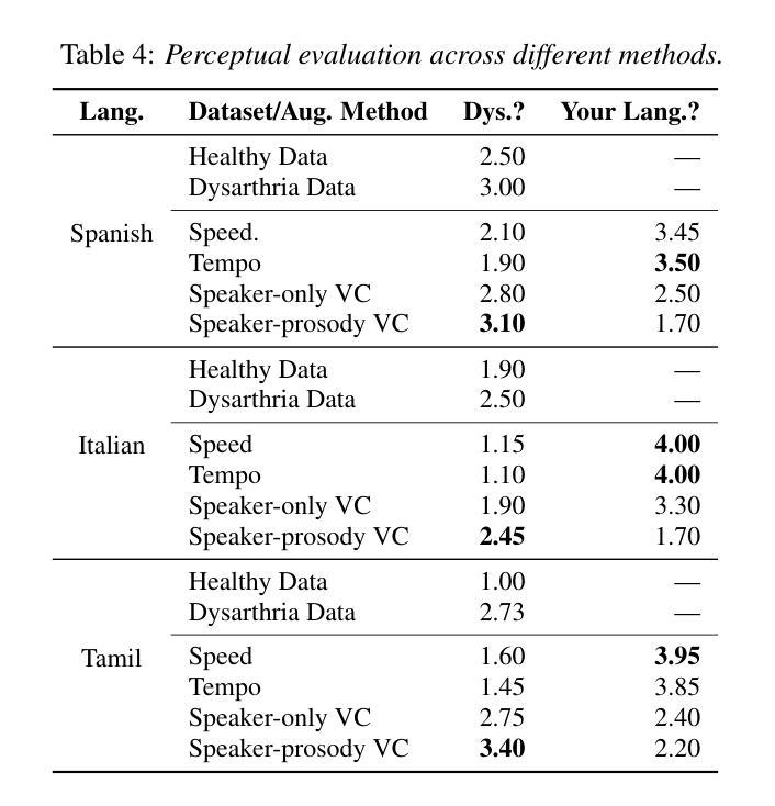 针对发音障碍者的语音识别(ASR)仍然是一个挑战,这主要是由于数据的稀缺性,特别是在非英语环境中。为了解决这个问题,我们对英语发音障碍语音(UASpeech)进行微调,以编码说话人的特征和韵律扭曲,然后将其应用于将健康的非英语语音(FLEURS)转换为非英语发音障碍语音。生成的数据随后用于微调多语言语音识别模型Massively Multilingual Speech(MMS),以提高对发音障碍语音的识别能力。在PC-GITA(西班牙语)、EasyCall(意大利语)和SSNCE(泰米尔语)上的评估表明,同时实现说话人和韵律转换的语音转换技术显著优于现成的MMS性能和传统的增强技术,如速度和节奏扰动。对生成数据的客观和主观分析进一步证实,生成的语音模拟了发音障碍的特征。