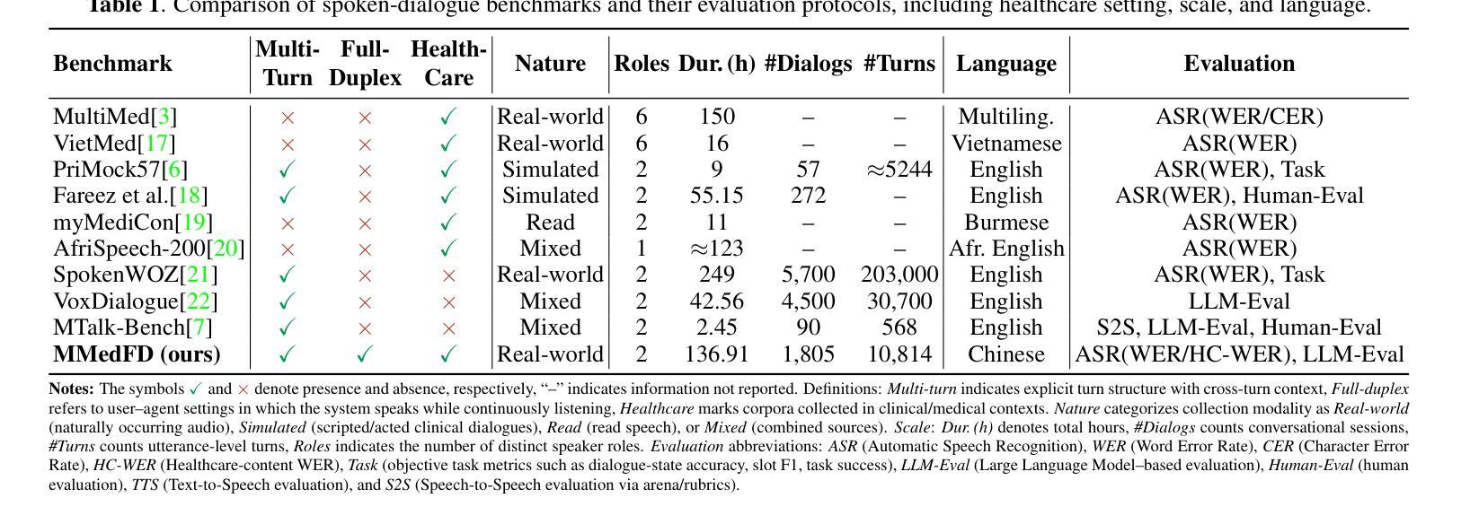 - MMedFD是首个为临床对话设计的汉语医疗ASR语料库,适用于多轮、全双工设置。