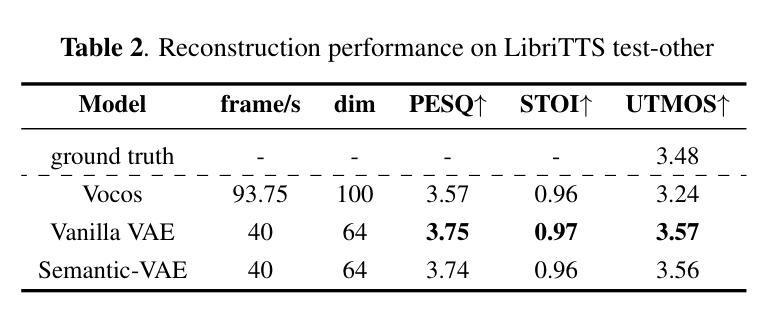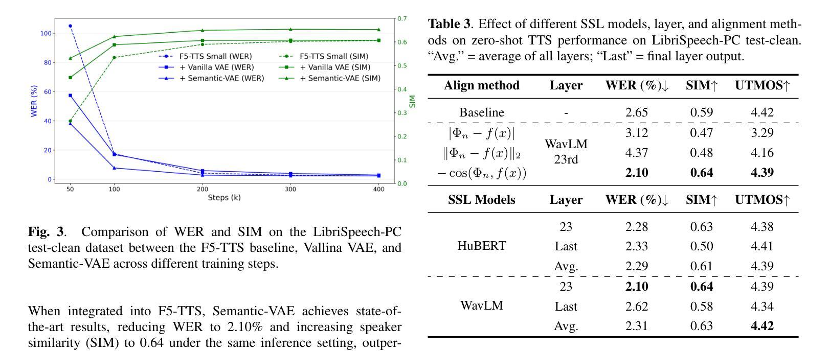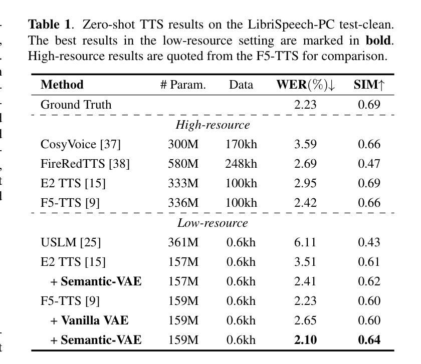 - 在LibriSpeech-PC上,将Semantic-VAE集成到F5-TTS中,实现了2.10%的WER(词错误率)和0.64的说话人相似性,优于基于mel的系统(2.23%,0.60)和普通的声学VAE基线(2.65%,0.59)。