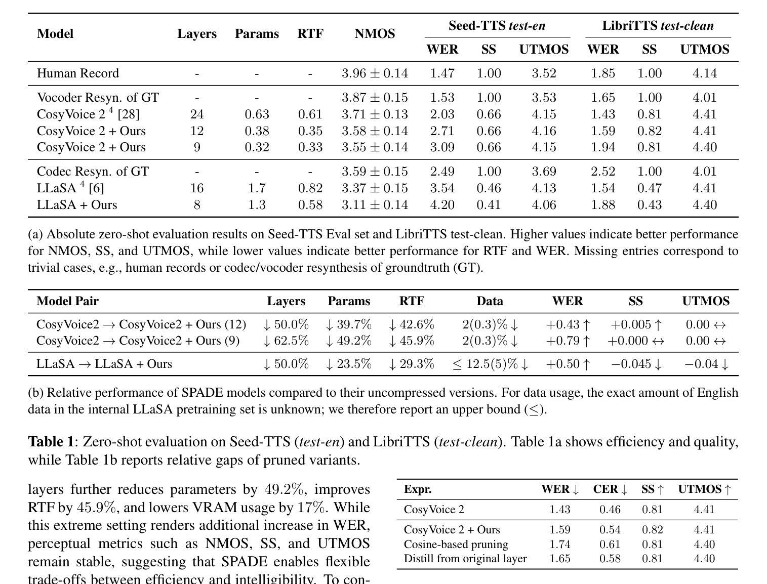 - 在零样本基准测试中,SPADE在保持近乎相等的感知质量的同时,实现了Transformer深度的减半。