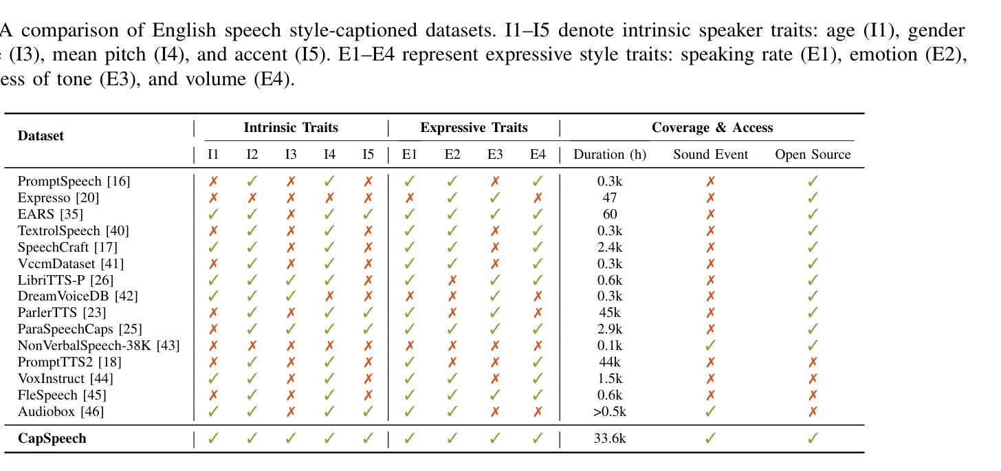 - CapSpeech数据集的推出填补了CapTTS相关任务的标准化综合数据集的空白。
