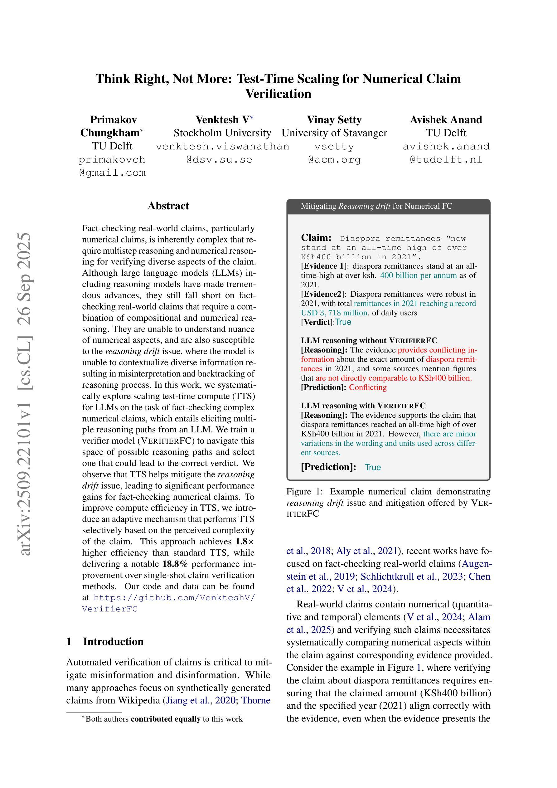 针对事实核查中的复杂数值主张,特别是需要多步骤推理和数值推理的主张,尽管大型语言模型(LLM)包括推理模型已取得显著进展,但仍存在不足。本工作系统地探索了利用测试时间计算(TTS)对LLM进行扩展,以应对事实核查复杂数值主张的任务。我们训练了一个验证器模型(VERIFIERFC),以在可能的推理路径中导航并选择可能导致正确结论的路径。观察发现,TTS有助于缓解推理漂移问题,显著提高事实核查数值主张的性能。为提高TTS的计算效率,我们引入了一种自适应机制,根据主张的复杂性有选择地进行TTS。该方法实现了比标准TTS高出1.8倍的计算效率,同时在单次主张验证方法上实现了18.8%的性能提升。